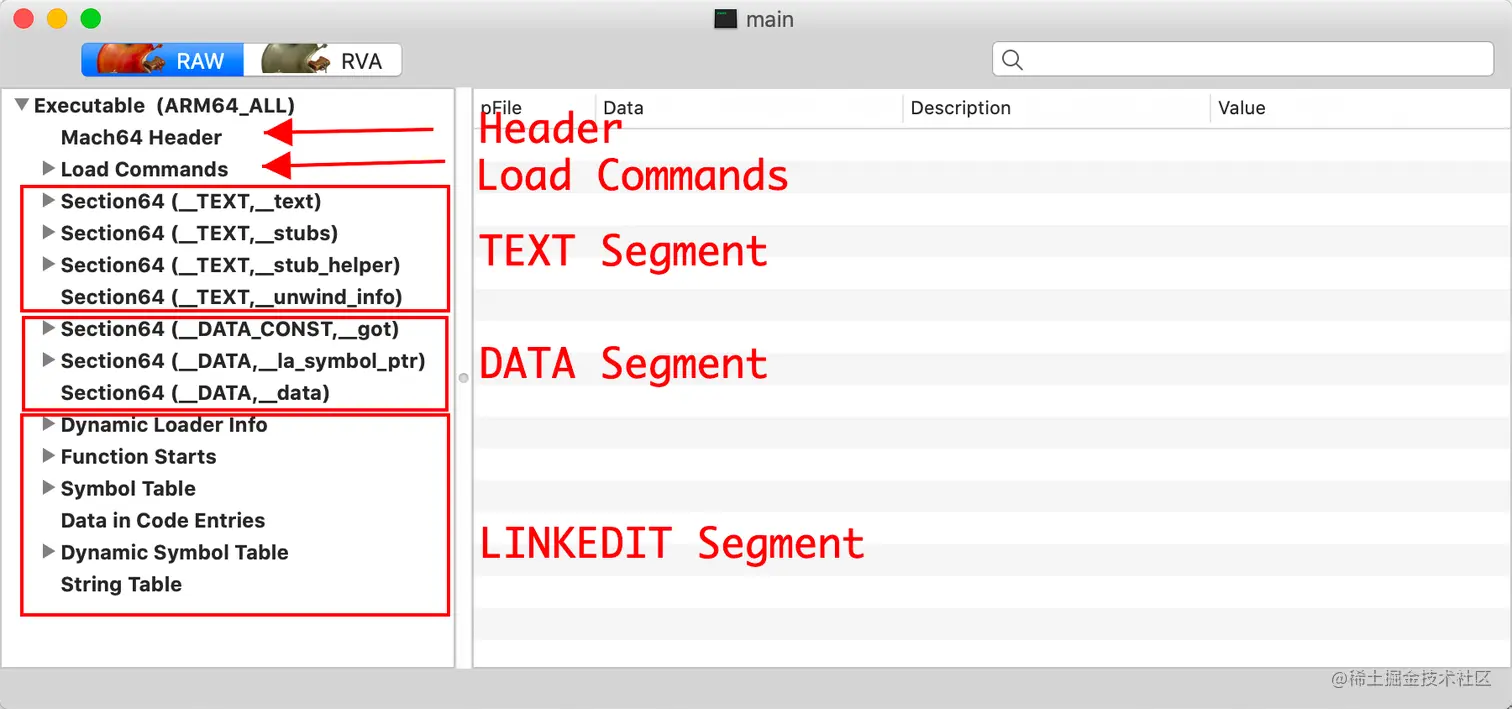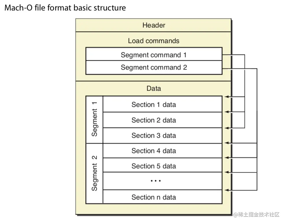 注意一下Mach-O的结构,以及Segment Command指向Section X Data