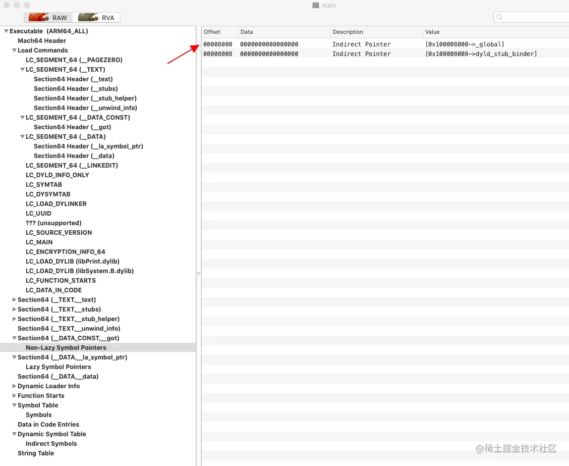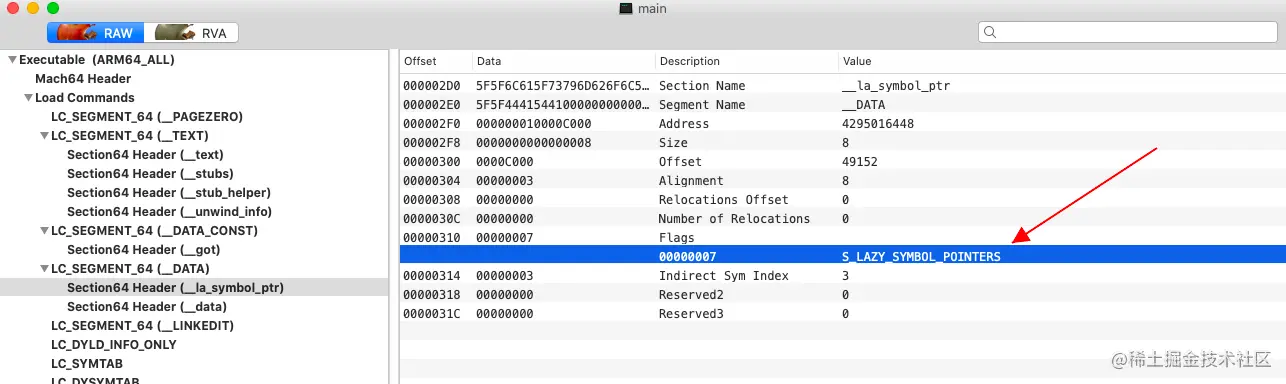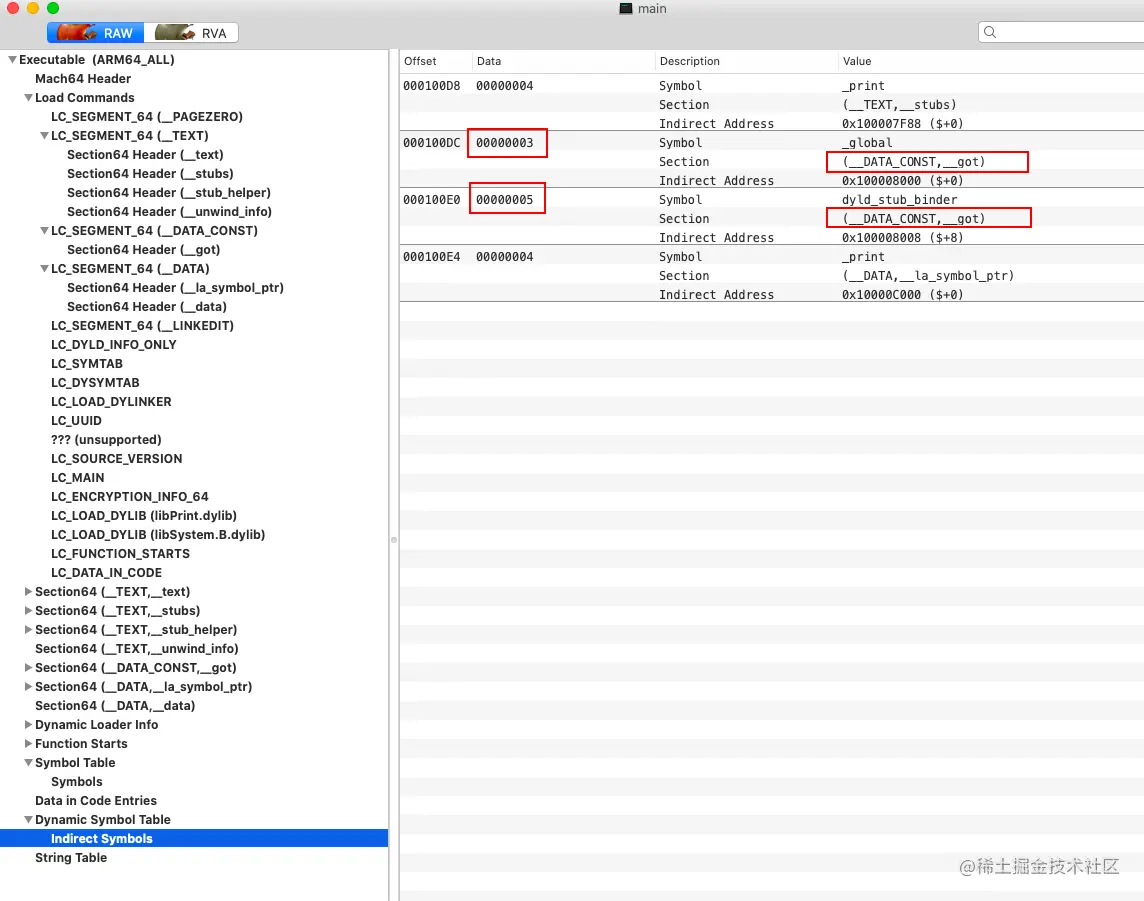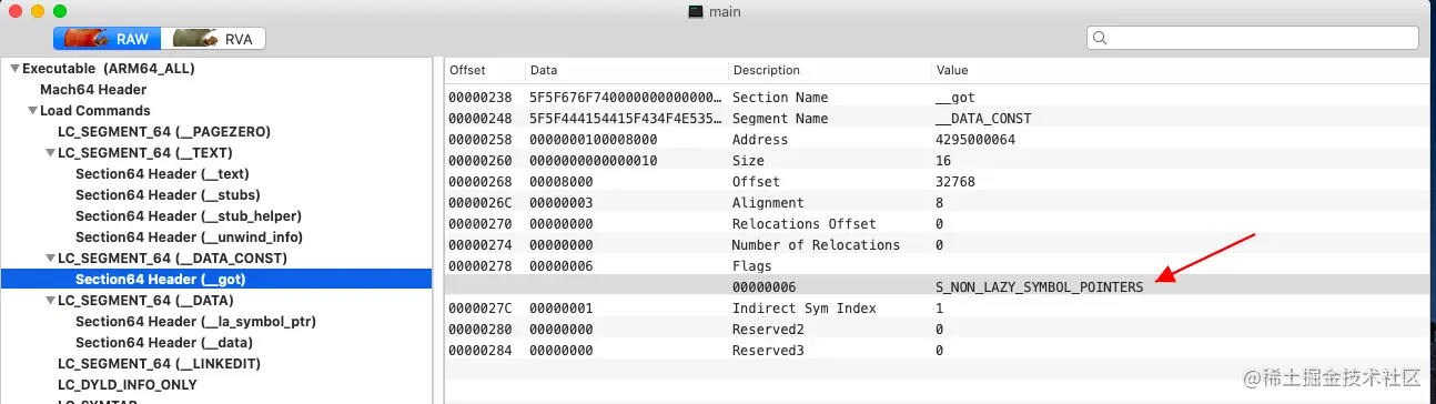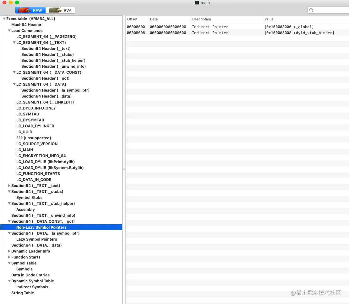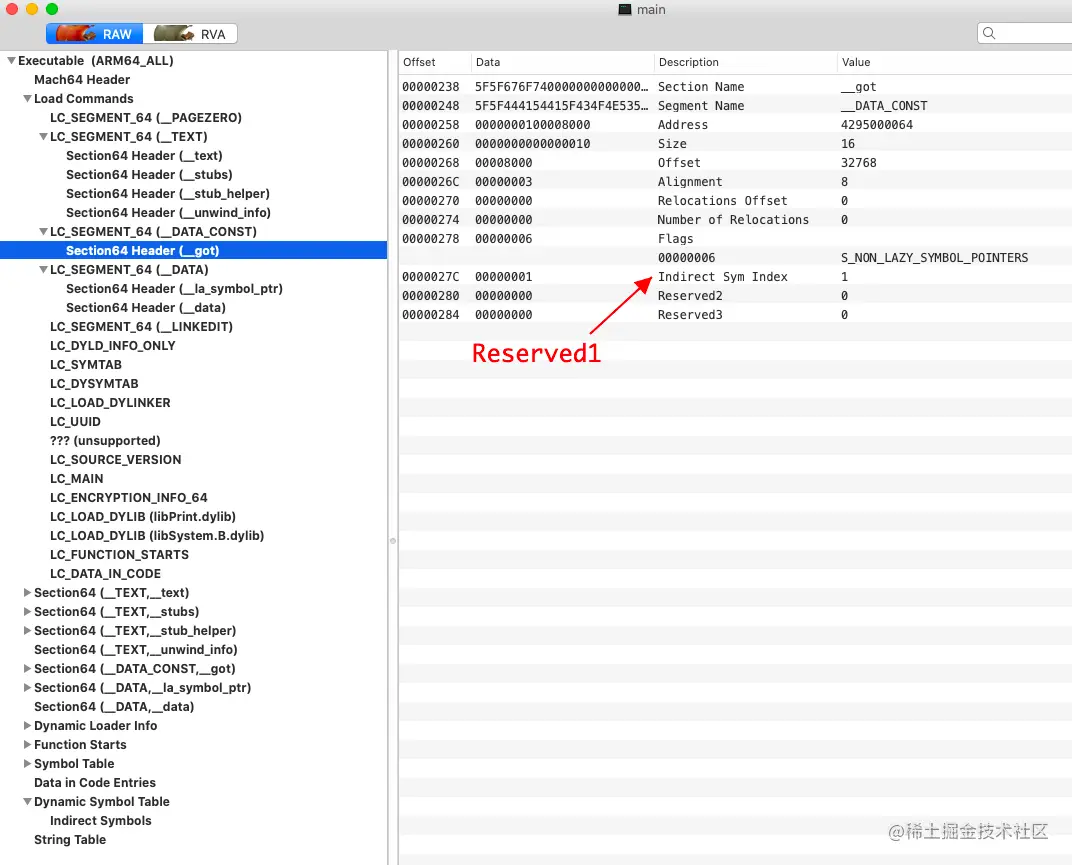在符号绑定(binding)前,__got里所有条目的内容都是 0,当镜像被加载时,dyld 会对__got每个条目所对应的符号进行重定位,将其真正的地址填入,作为条目的内容。__got各个条目的具体值,在加载期会被 dyld 重写,这也是为啥这个 section 被分配在 __DATA segment 的原因。