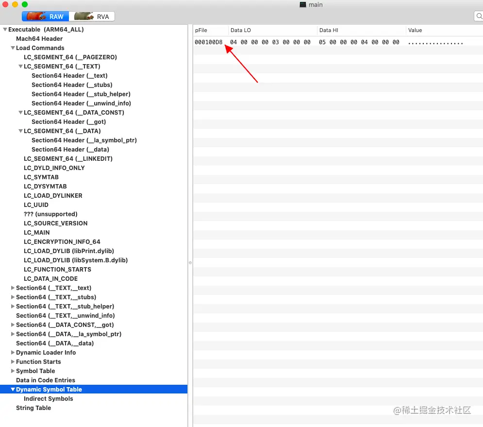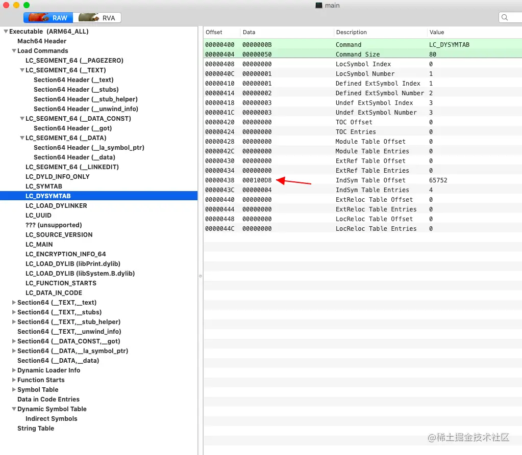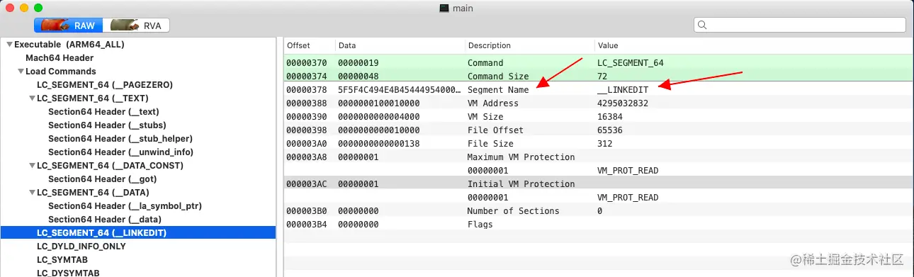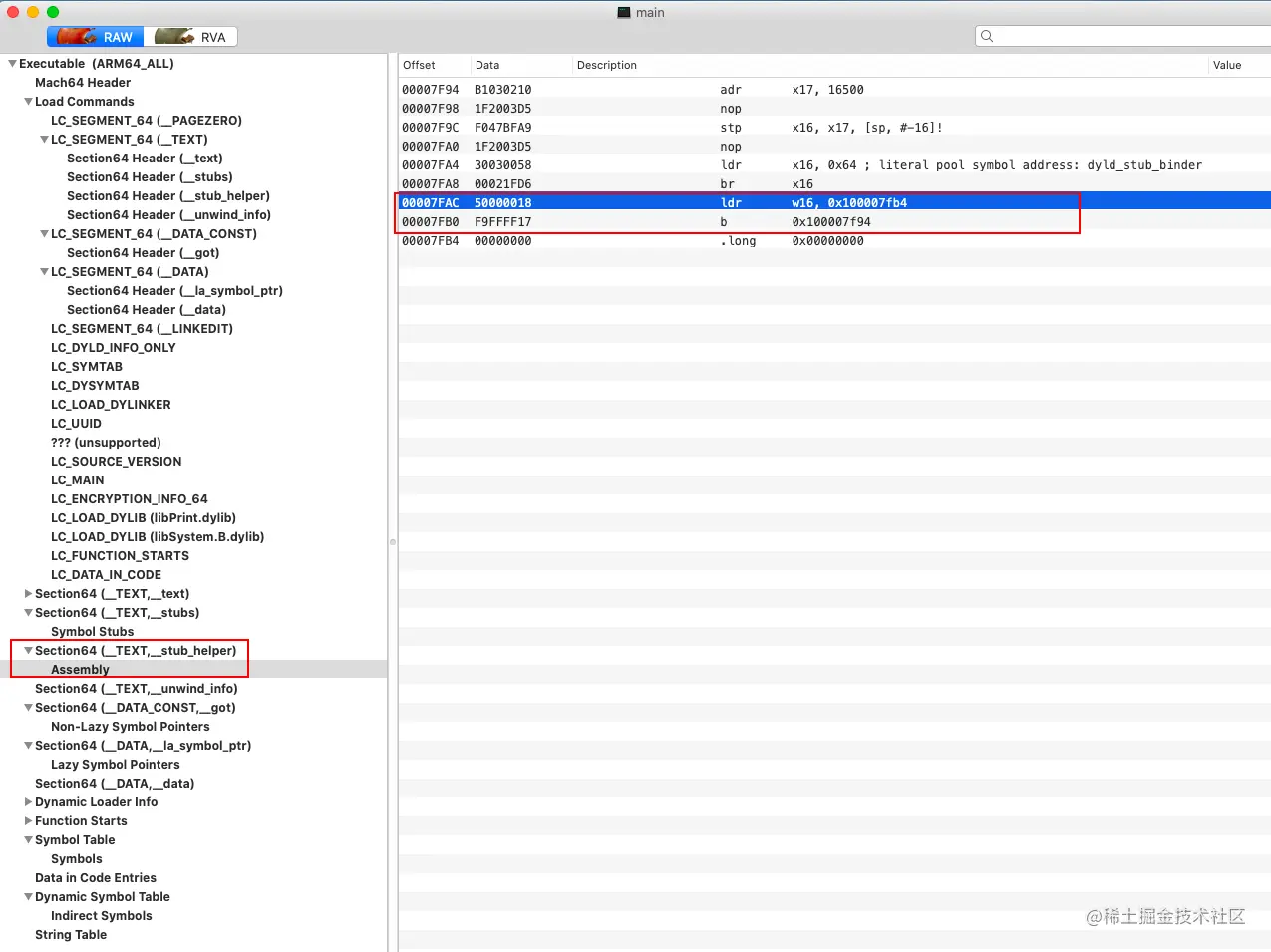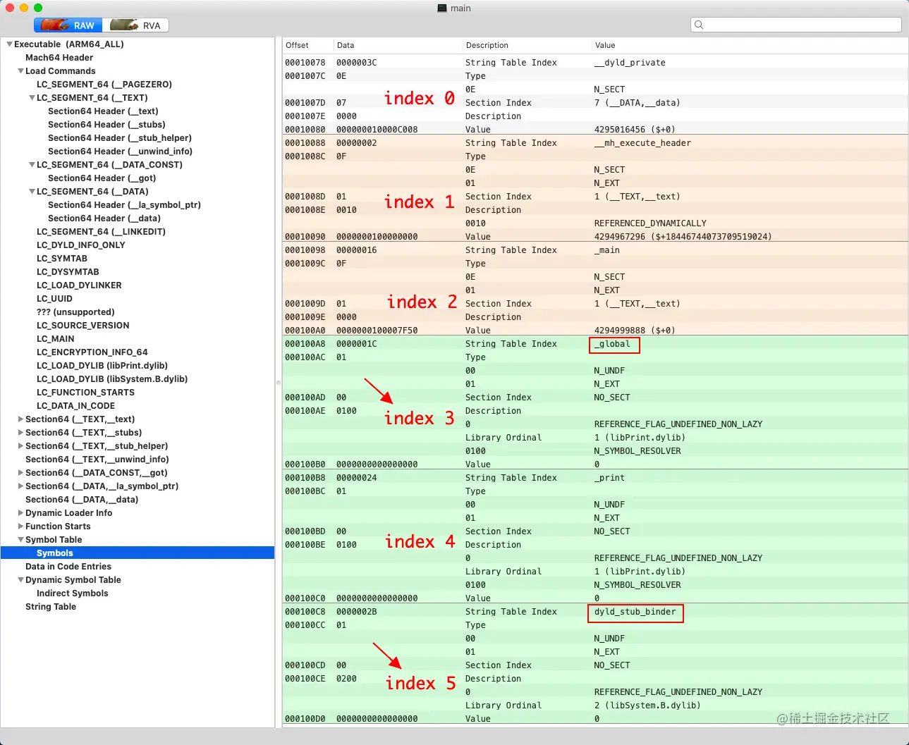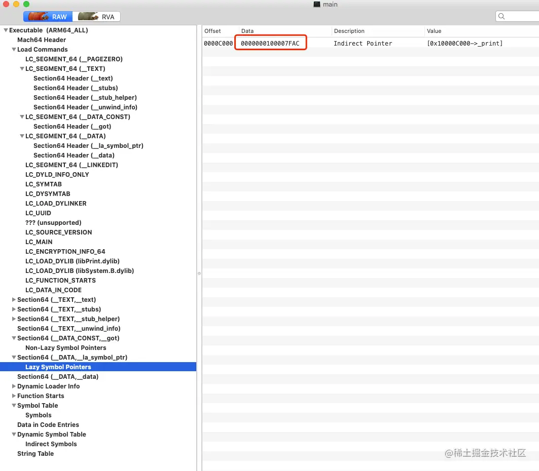 在符号绑定(binding)前,__got里所有条目的内容都是 0,当镜像被加载时,dyld 会对__got每个条目所对应的符号进行重定位,将其真正的地址填入,作为条目的内容。__got各个条目的具体值,在加载期会被 dyld 重写,这也是为啥这个 section 被分配在 __DATA segment 的原因。