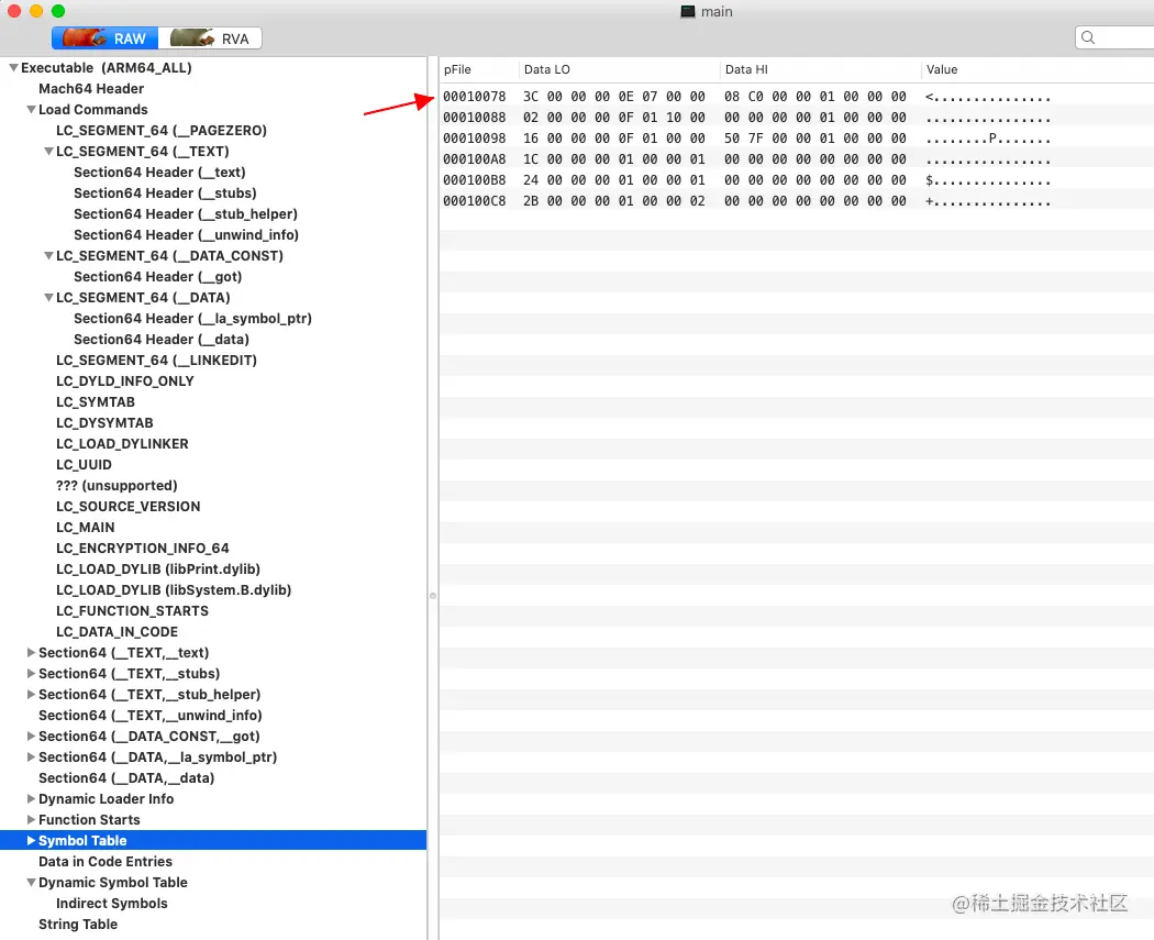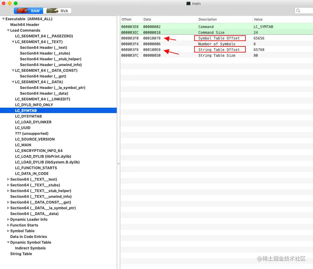 这个符号表本身是一个struct nlist的数组(结构体在<mach-o/nlist.h>),并且每个nlist包括了一个索引到__LINKEDIT string table,那里是实际存储符号名称的地方。