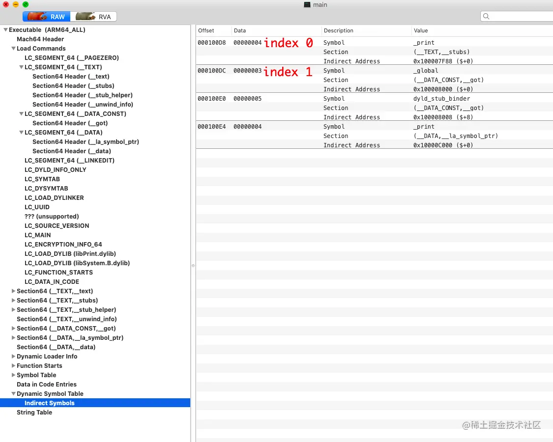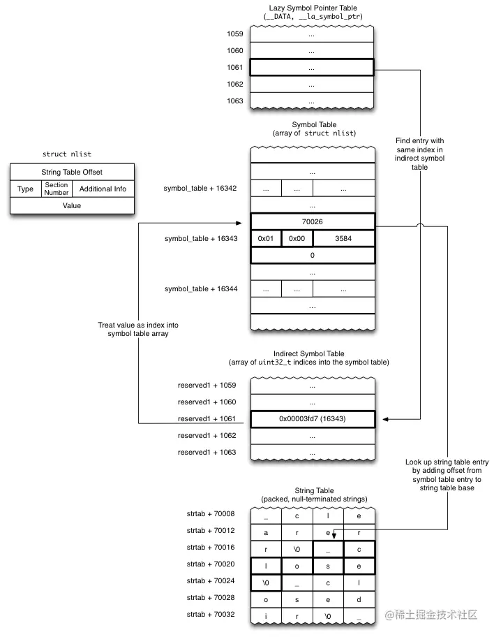 对于这两个section,section header(struct section结构体在<mach-o/loader.h>)提供偏移量(在reserved1字段中),是间接符号表中的偏移位置。间接符号表也存在二进制的 __LINKEDIT Segment中,间接符号表就是一个索引数组,索引值指向符号表(也是在__LINKEDIT),符号表的目的是为了定位非懒加载和懒加载符号section中的函数指针。有了结构体struct section nl_symbol_ptr, 符合的符号表中的index第一个section中的地址是indirect_symbol_table[nl_symbol_ptr->reserved1].