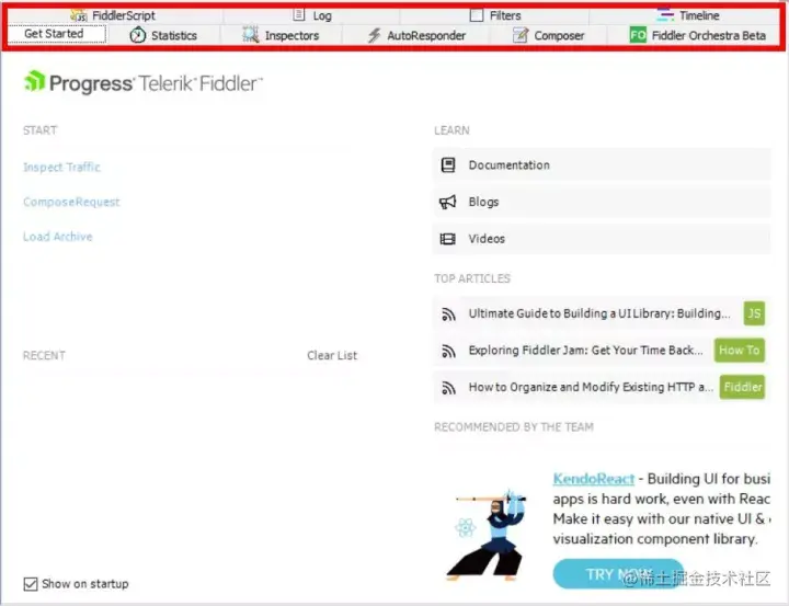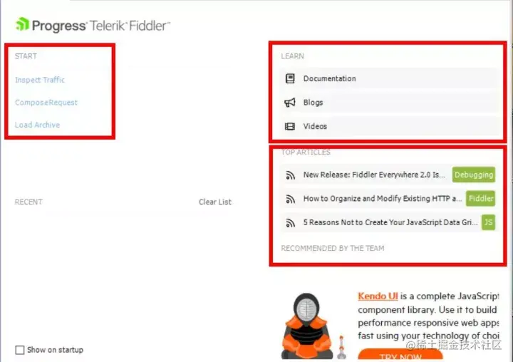 左侧 START 快速开始检查数据包、构建请求;右侧 LEARN 有 Fiddler 官方文档、推荐博客、学习 Video;右侧 TOP ARTICLES 显示当前热门文章。