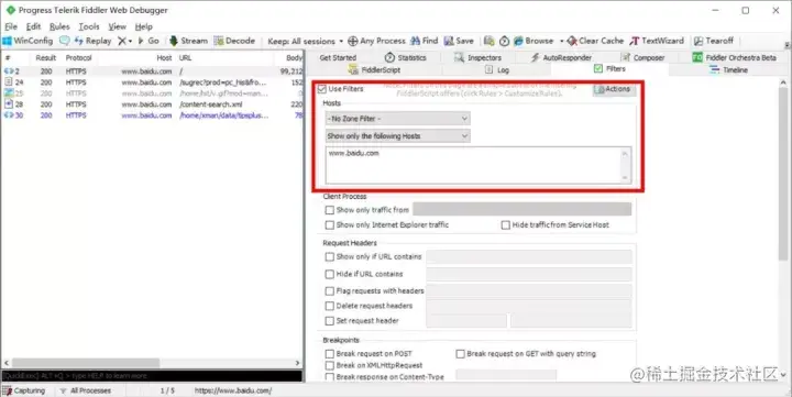 Fiddler 会自动抓取浏览器所有会话,用户可使用 Filter 过滤无用请求。