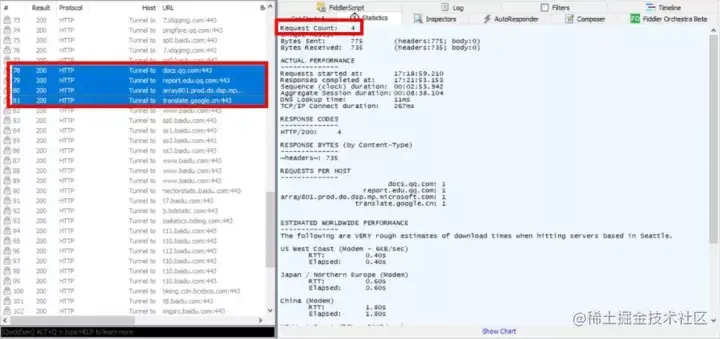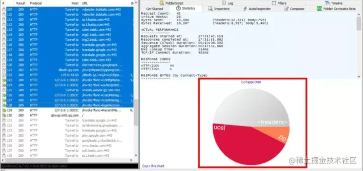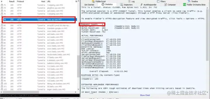 统计 HTTP 请求的性能信息,比如请求数、发送请求的字节数、接收到的字节数、客户端连接的时间、全部花掉的时间等。并且一次可选择多条请求数据合并统计,还可以点击 Show Chart 按钮显示统计图形。