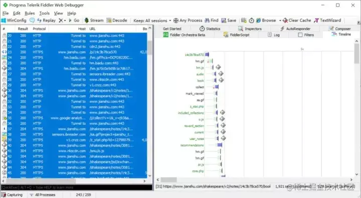 左边面板都看完之后,接下来再看下右侧面板 Get Started 欢迎页签、Statistics 统计页签、inspectors 检查页签、AutoResponse 自动响应页签、composer 构建页签、log 日志页签、Filters 过滤页签、Timeline 请求响应时间、Fiddler Script Fiddler 脚本。
