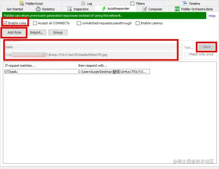 配置 AutoResponder 规则拦截满足规则的求情,并返回本地资源或 Fiddler 资源,取代代替服务器响应。例如:当请求 URL 中出现 baidu 这个关键字,响应替换成电脑本地某张图片。具体步骤:a. 点击 Add Rule 按钮b. Rule Editor 第一行输入关键字 baidu,第二行输入本地某张图片c. 点击 Save 按钮d. 勾上 Enable rules