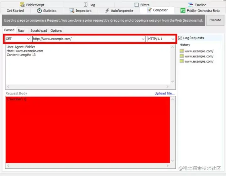 Composer 允许用户自定义请求,可以手动创建一个新请求,也可以在会话表中拖拽现有的请求,Parsed 模式中可以选择请求方式、URL、协议版本、Request Body 等。