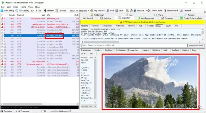 配置完后再访问含有 baidu 的 URL,在 Fiddler 响应中能看到本地图片。