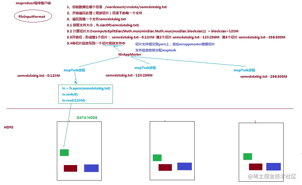 ( 3 )注意: block 是 HDFS 上物理上存储的存储的数据,切片是对数据逻辑上的划分。两者之间没有关系。即使 hdfs 上是 128M 存储, Mapreduce 也会切片,只是默认切片也是 128M 。也可以非 128M 切片,如 100M ,多余的部门由框架内部处理和其他结点进行拼接切片。因为切片决定了给其分配 mapTask 进程数量。