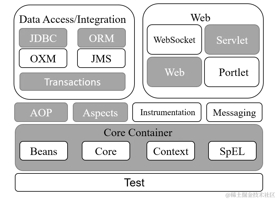 Instrumentation:提供了类工具的支持和类加载器的实现,可以在特定的应用服务器中使用。
