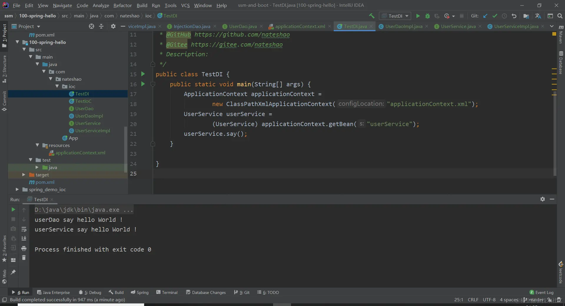 - 在com.nateshao.ioc包中,创建测试类TestDI,来对程序进行测试。