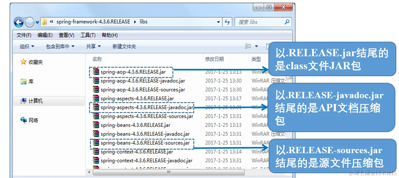 Spring开发所需的jar包分为两个部分:Spring框架包和第三方依赖包。