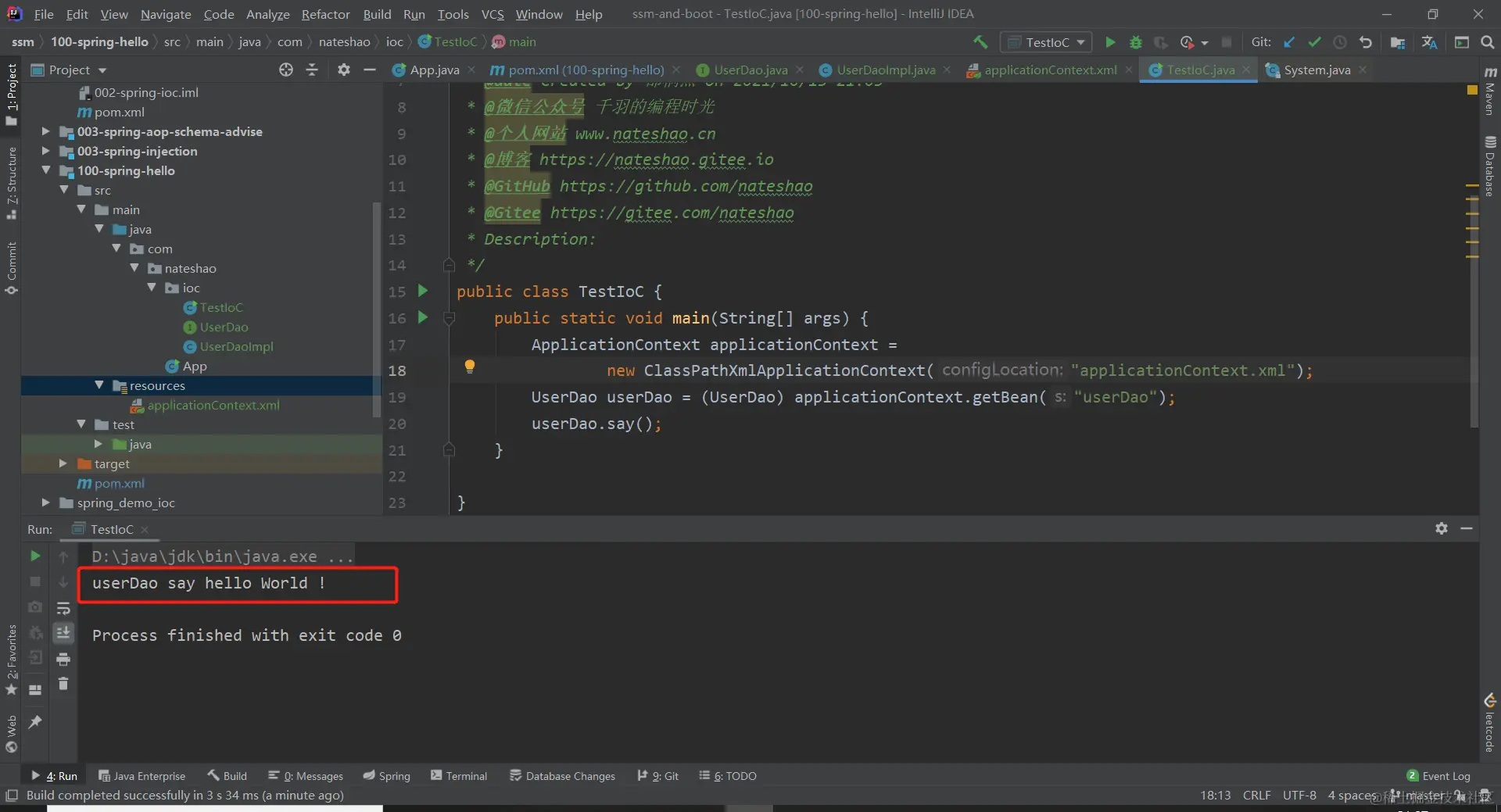 在main/java目录下,创建一个com.nateshao.ioc包,并在包中创建接口UserDao,然后在接口中定义一个say()方法。