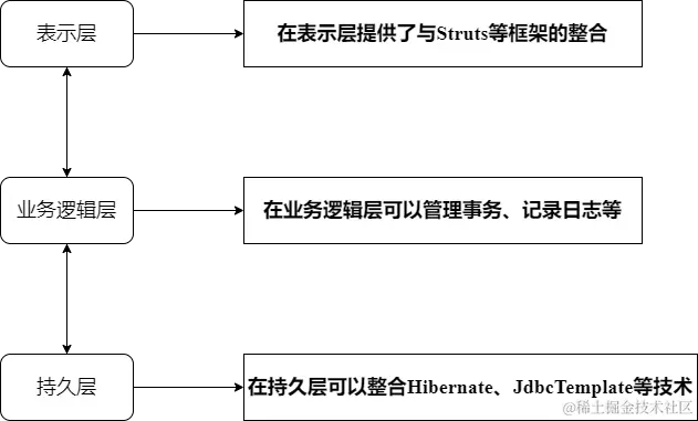 在实际开发中,通常服务器端在采用三层体系架构,分别为表示层(Web)、业务逻辑层(Service)、持久层(Dao), Spring对每一层都提供了技术支持。