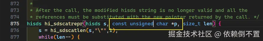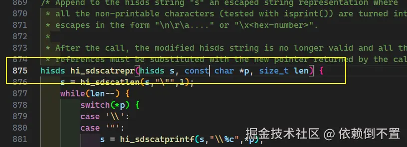 然后找到源码目录中deps/hiredis/sds.c源文件,找到第875行的hisds hi_sdscatrepr函数实现如下: