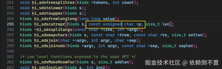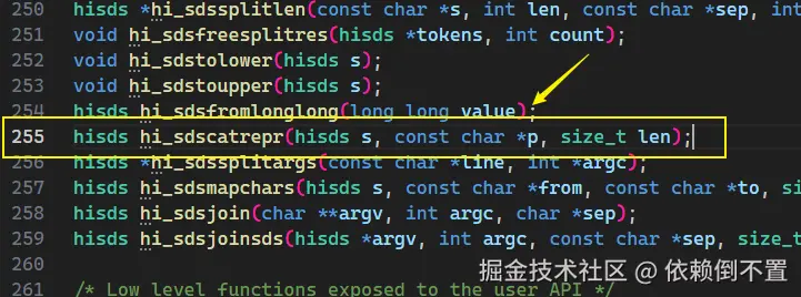 首先找到源码目录中的deps/hiredis/sds.h头文件,找到第255行的hisds hi_sdscatrepr函数声明如下: