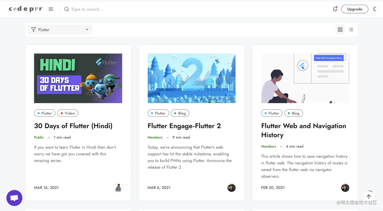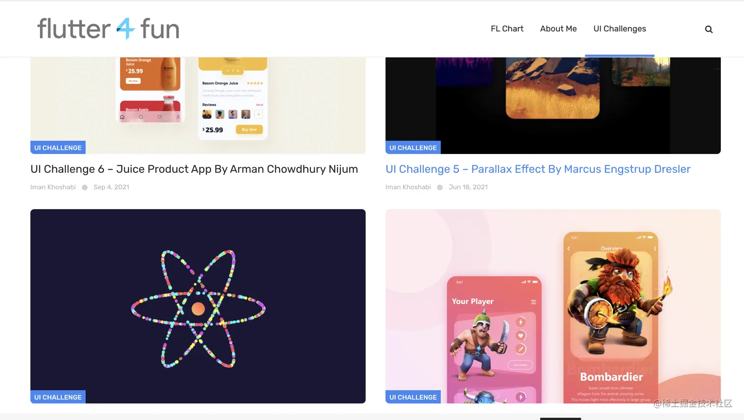 该网站致力于 挑战 各种 界面优美、交互高级的页面绘制,通过这个网站,可以学到用户界面设计感和各种动效。Fl chart插件也是该网站的,用于绘制图表类界面。