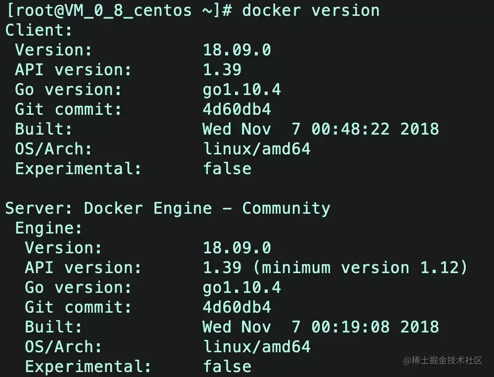 在命令行下输入docker version输出一堆版本信息即代表安装成功。