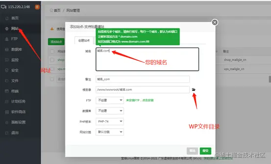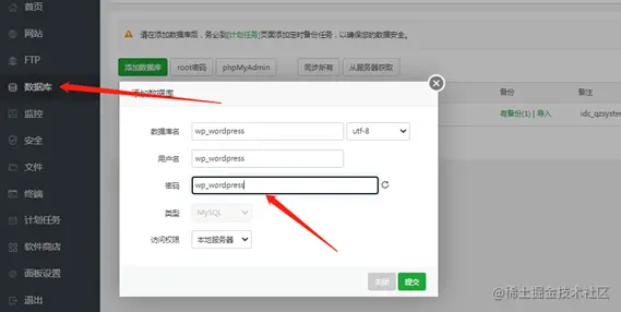 7、在宝塔中,创建MYSQL数据库,我这里的数据库名字,数据用户名,数据库密码都是wp_wordpress