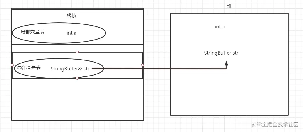 同样执行ReferencePassing方法执行的时候,虚拟机栈同样会生成一个栈帧。只不过局部变量表中存放的是sb的引用地址,而这个地址指向的正是堆中的str对象。