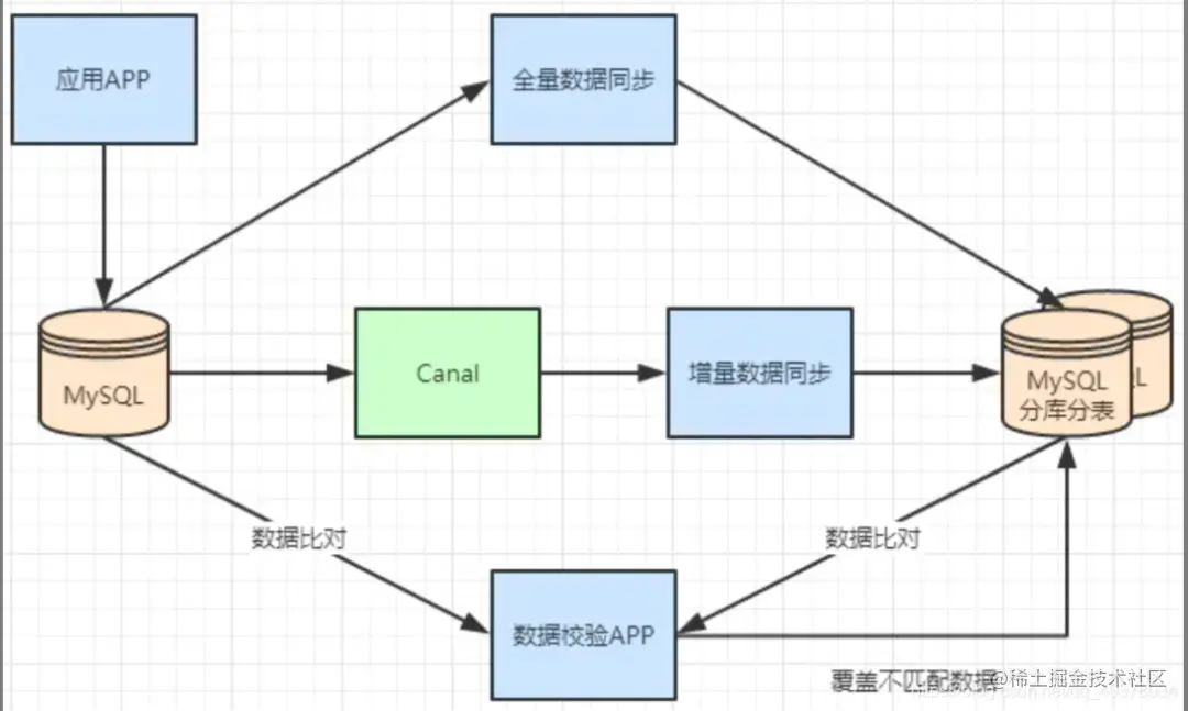 - 利用MySQL+Canal做增量数据同步,利用分库分表中间件,将数据路由到对应的新表中