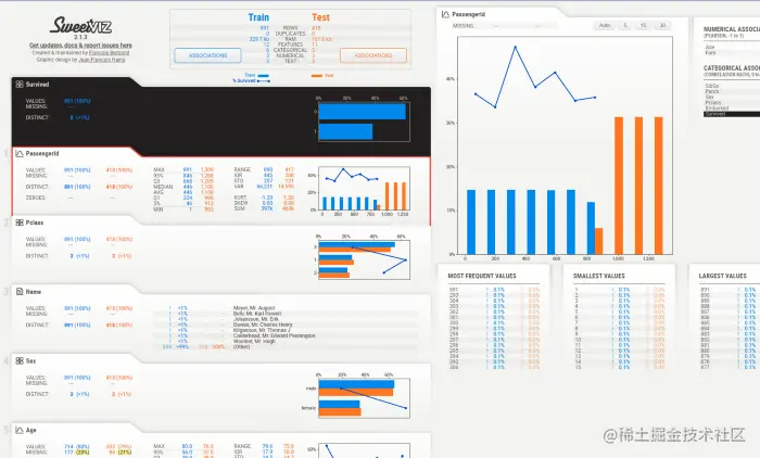 Sweetviz会生成色彩艳丽的报表,且因为运算做过优化,生成速度也会比Pandas Profiling快一些。