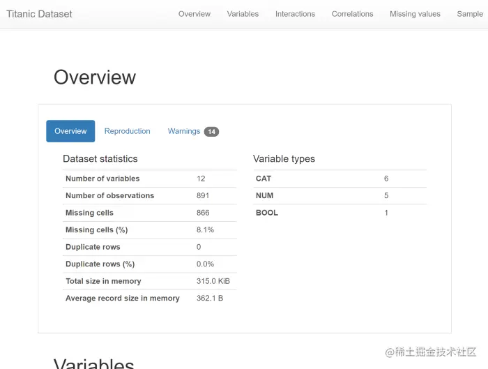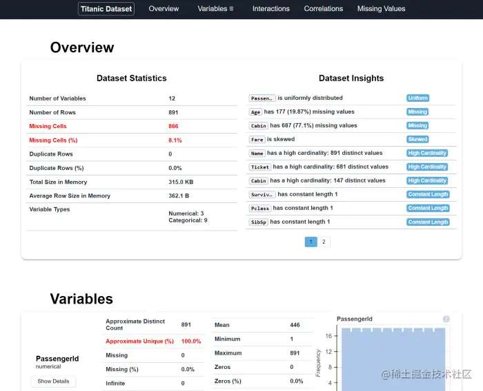 pandas-profiling会将EDA结果绘制成一份可以交互的html报表,针对每个特征进行分析,包含数据分布、缺失值、相关性等。使用方法非常简单,代码如下: