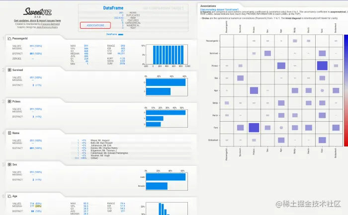 Sweetviz也是近期非常流行的EDA工具,和上面的Pandas Profiling的一样可以数据的快速探索,但对变量间的相关分析比较少。