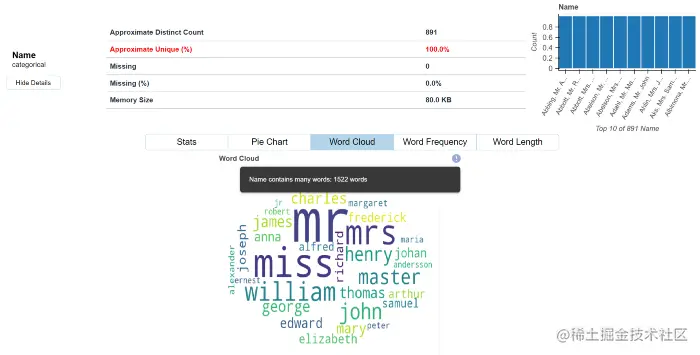 Dataprep的呈现方式和pandas-profiling很像但是更细腻,也更细粒度。对文本特征内容会用词云图进行展示。