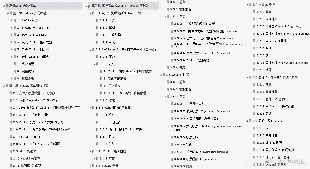 为了让大家更快了解和上手 Kotlin,特地分享这份谷歌开源的《kotlin入门进阶实战》,希望可以帮助大家用最短时间学习 Kotlin。教程通俗易懂,实例丰富,既有基础知识,也有进阶技能,能够帮助读者快速入门进阶,是你学习Kotlin的葵花宝典,快收藏起来!!!