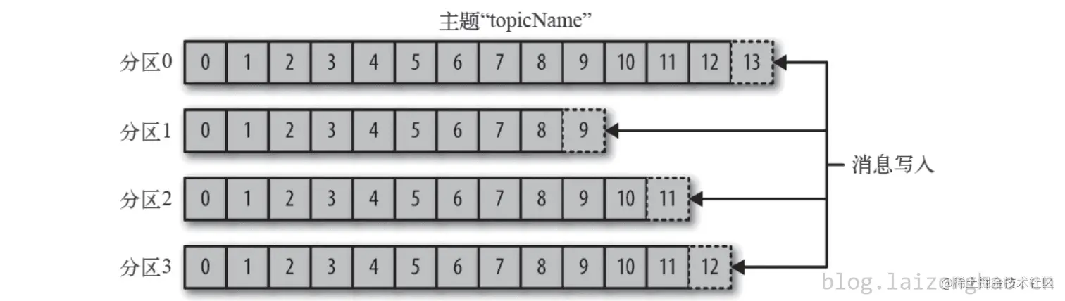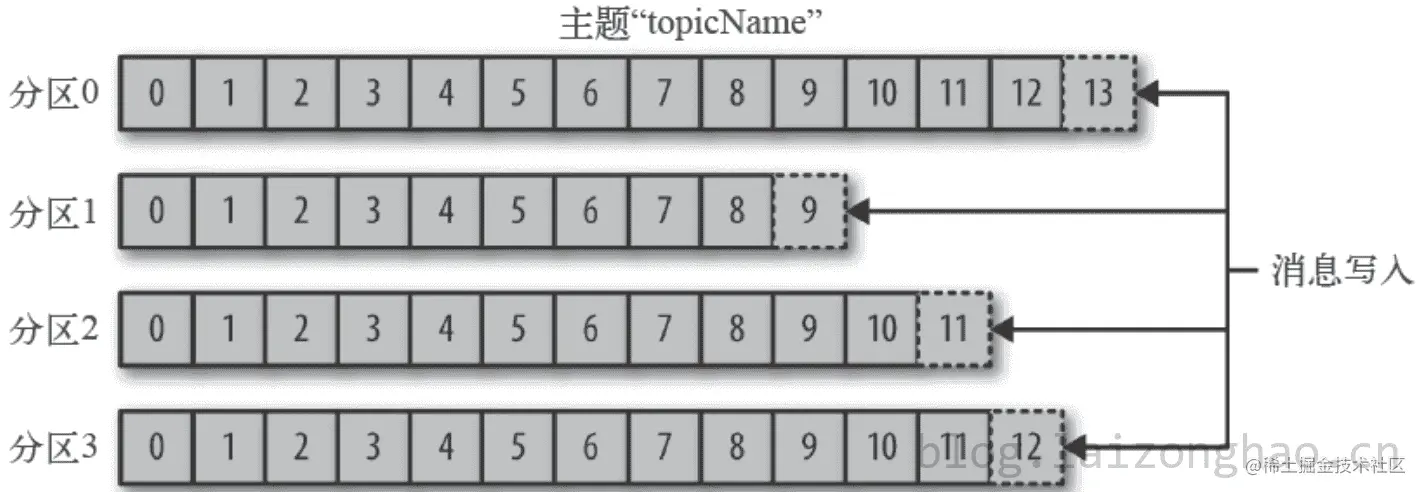 - 消息以追加的方式写入分区,然后以先入先出的顺序从分区中读取。