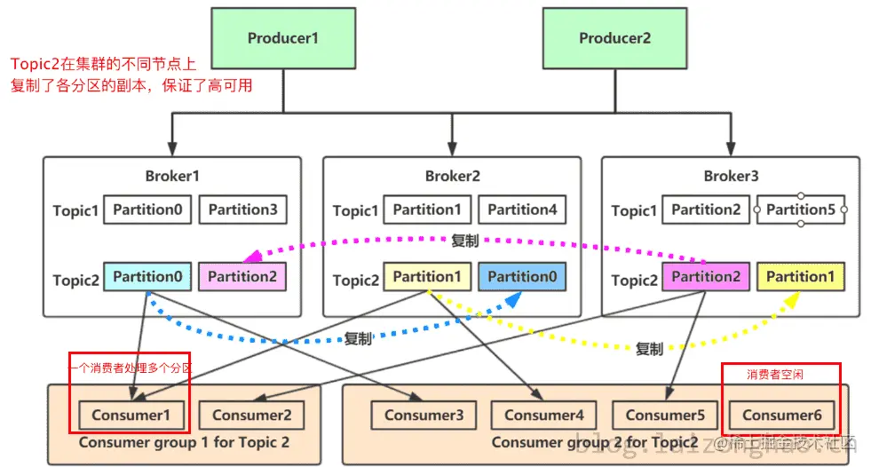 一个分区可以分配给多个broker,此时会发生分区复制。分区的复制提供了消息冗余,高可用。