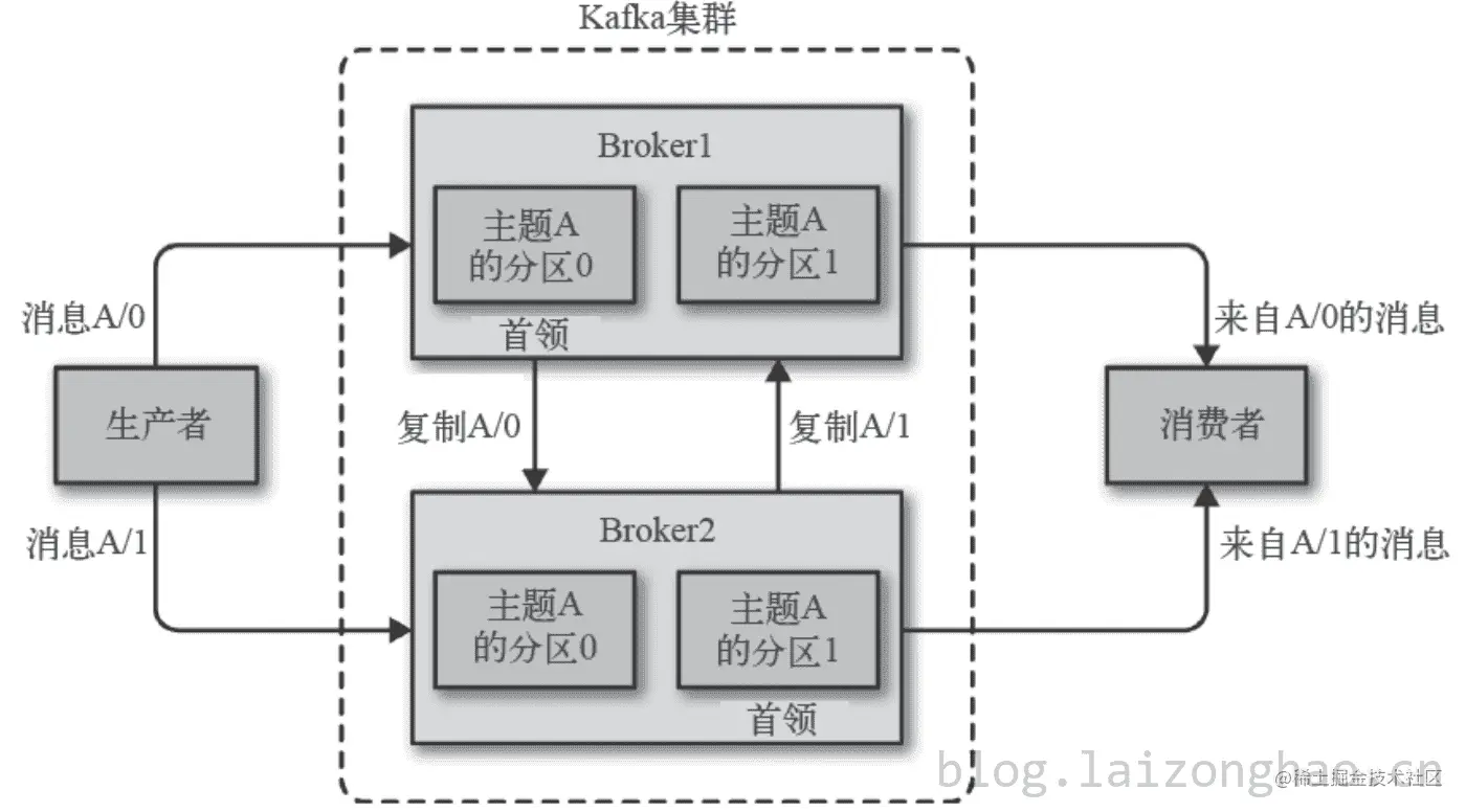 一个独立的Kafka服务器称为broker。broker接收来自生产者的消息,为消息设置偏移量,并提交消息到磁盘保存。broker为消费者提供服务,对读取分区的请求做出响应,返回已经保存到磁盘上的消息。
