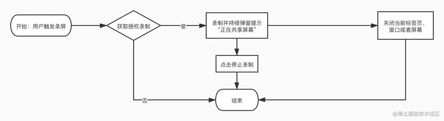 常见的有感录屏方案主要是通过 WebRTC 录制。WebRTC 是一套基于音视轨的实时数据流传播的技术方案。由浏览器提供的原生 API navigator.mediaDevices.getDisplayMedia 方法实现提示用户选择和授权捕获展示的内容或窗口,进而将获取 stream (录制的屏幕音视流)。我们可以对 stream 进行转化处理,转成相对应的媒体数据,并将其数据存储。后续需要回溯该次录制内容时,则取出媒体数据进行播放。