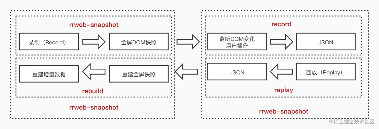 rrweb 提供 record 和 replay 两个 API,分别实现记录所有增量数据和将记录的数据按照时间戳回放的两个功能。