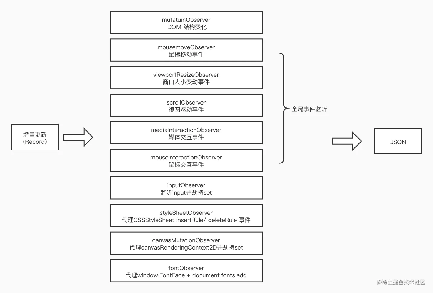 rrweb 开源库主要由 rrweb-snapshot、**rrweb ** 和 rrweb-play 三部分组成,并且提供了动作筛选,数据加密、数据压缩、数据切片、屏蔽元素等功能。