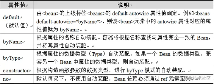 所谓自动装配,就是将一个Bean自动的注入到到其他Bean的Property中。 Spring的元素中包含一个autowire属性,我们可以通过设置autowire的属性值来自动装配Bean。autowire属性有5个值,其值及说明下表所示: