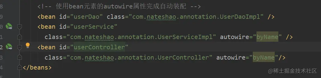 <bean id="userController" class="com.nateshao.annotation.UserController" autowire="byName" />