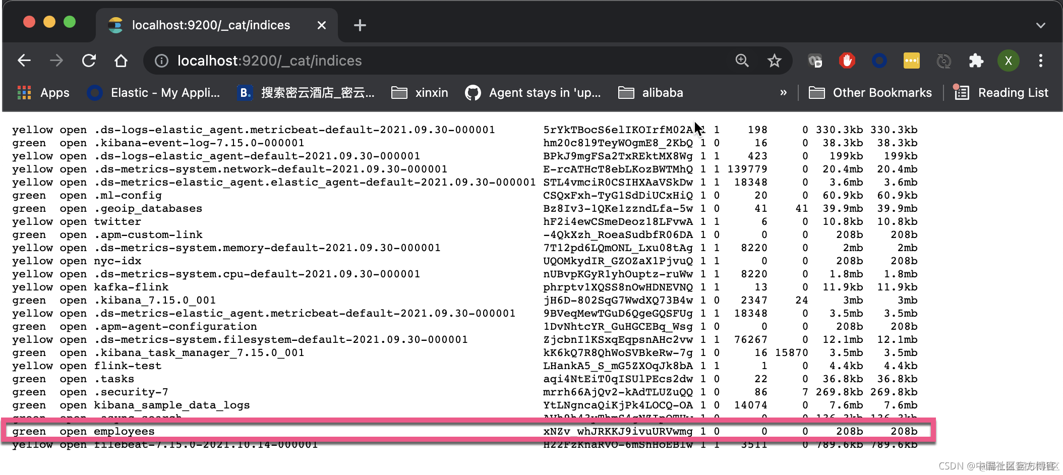 在引用启动后,它会自动帮我们创建一个叫做 employees 的索引。我们可以在浏览器中打入如下的地址: