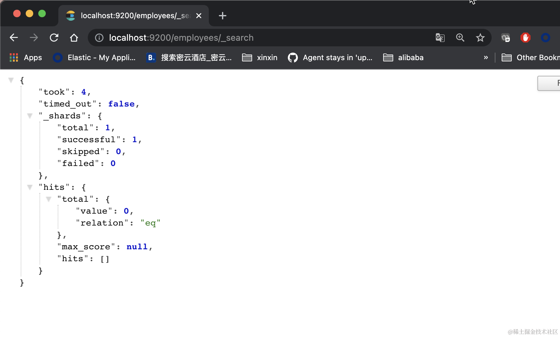 从上面的返回结果看出来,employees 里没有任何的数据。 如果在你的浏览器中不是以这种非常好看的缩进格式显示的结果,建议你可以安装 JSON formatter 插件。