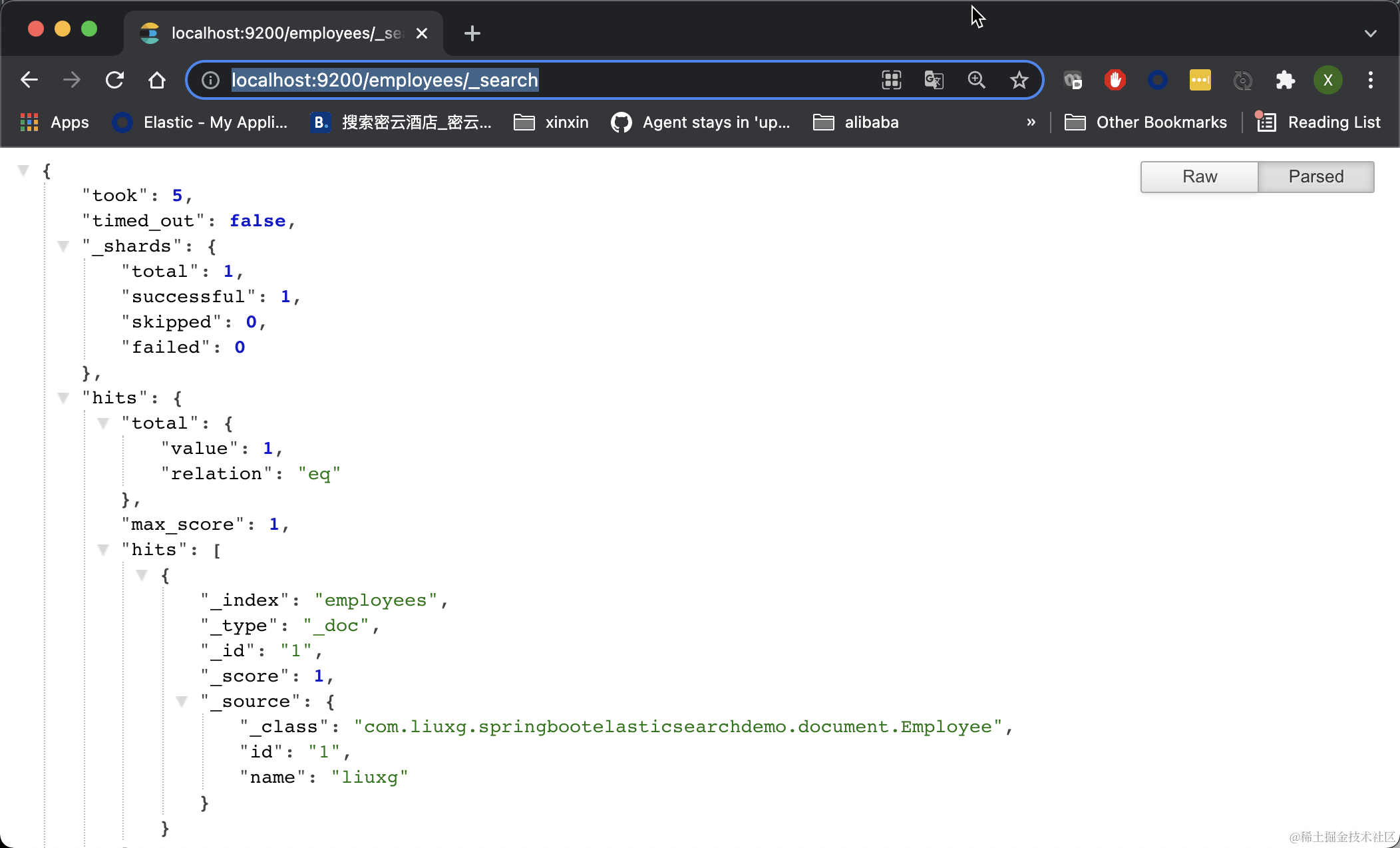 在上面,我们通过接口 http://localhost:9999/api/employee 向 Elasticsearch 发送一个如下的数据: