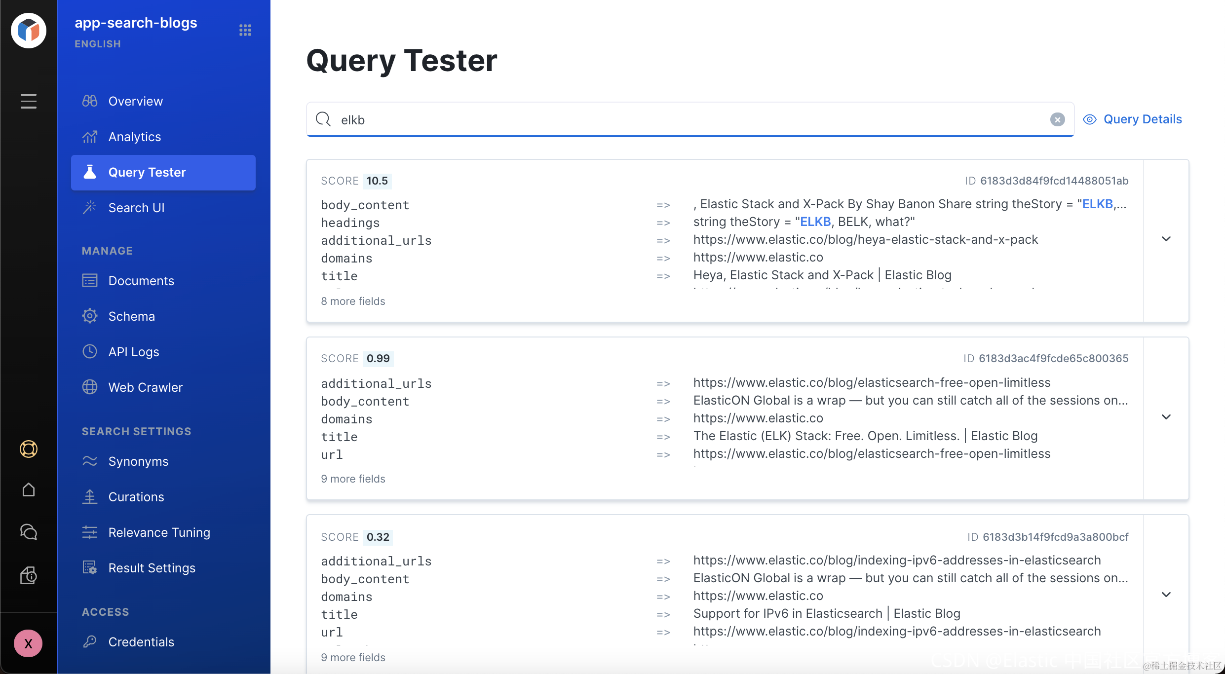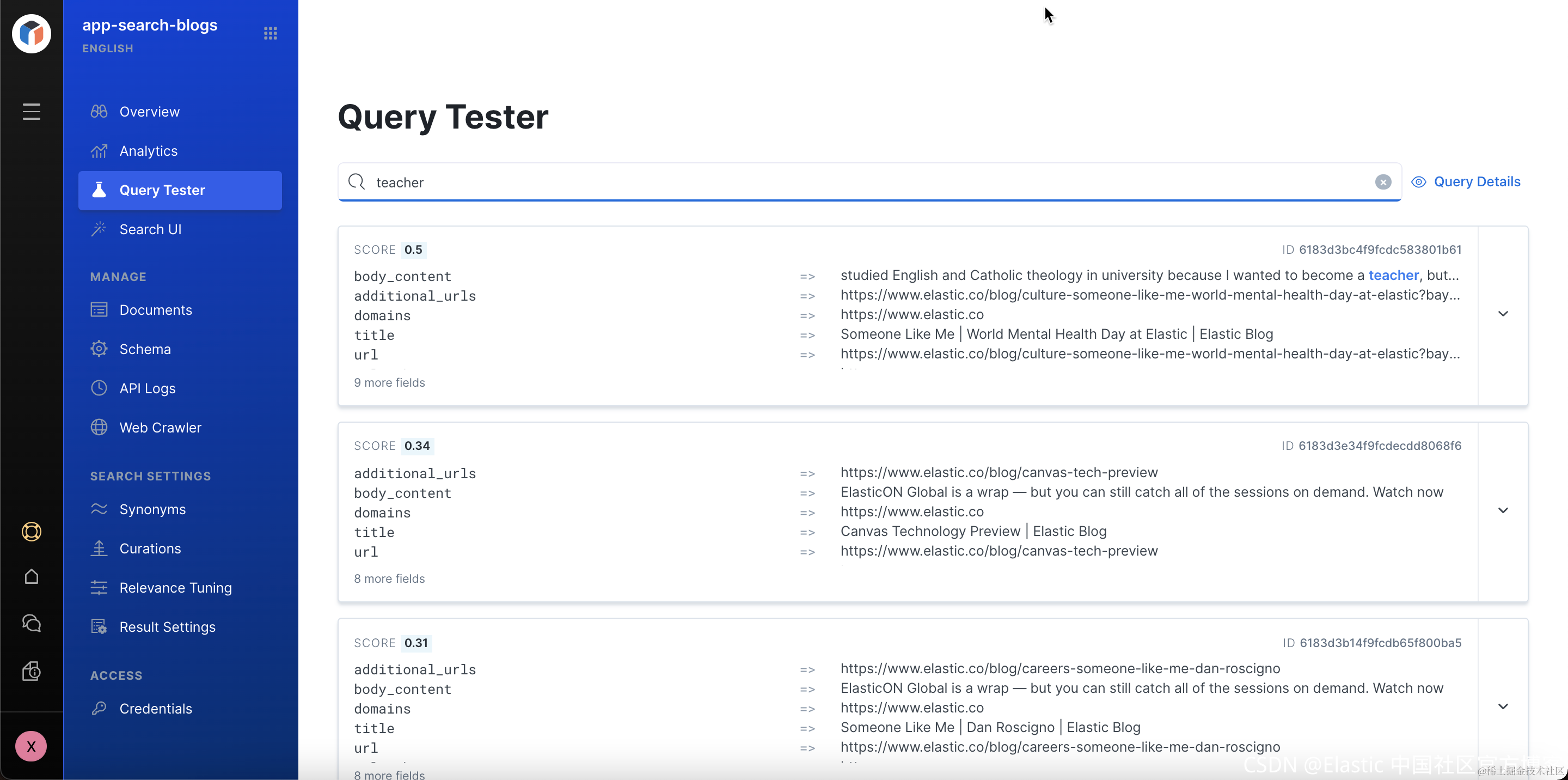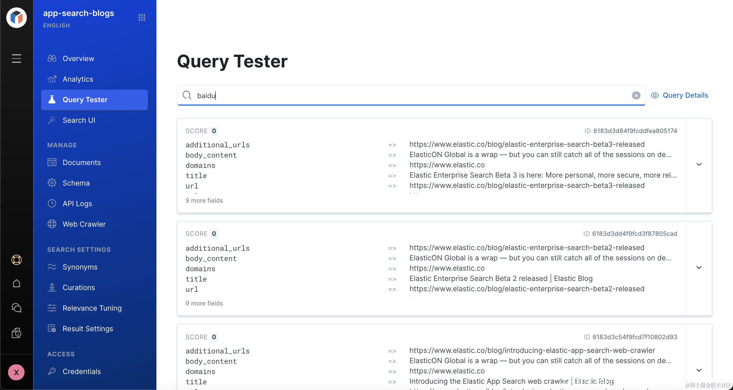 显然最上面显示的文档就是我们在 Curations 里面设置的那几个文档。它们的排名最靠前。