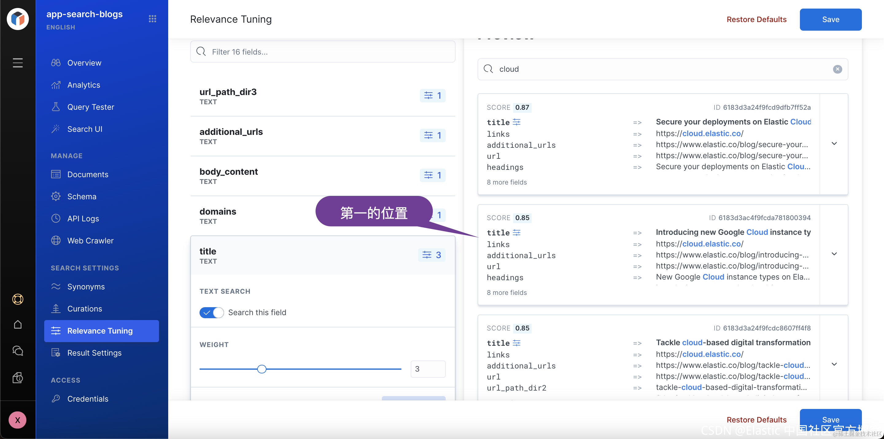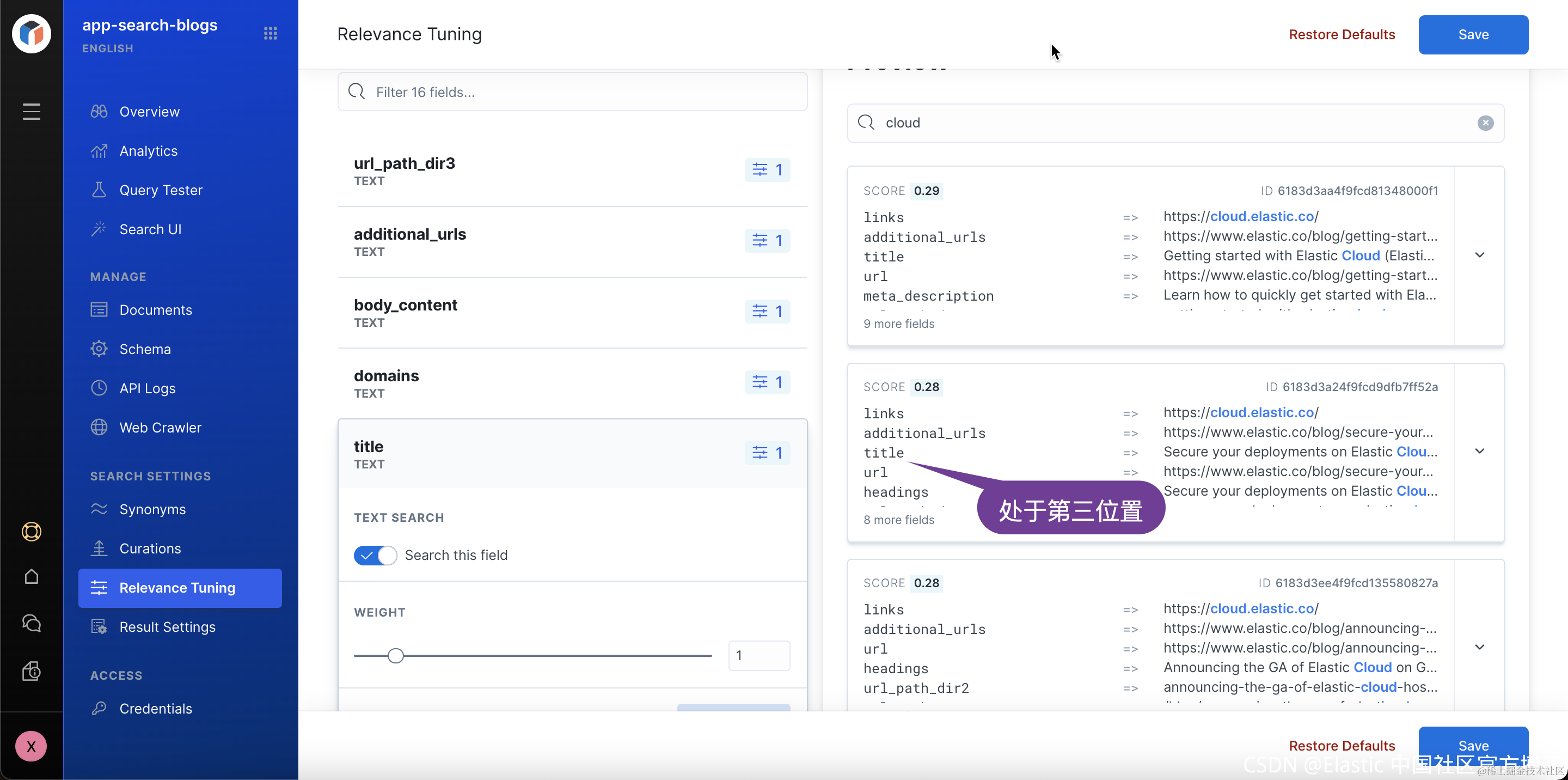 2) 在此视图中,你可以管理引擎每个字段的权重和提升。 请注意,默认情况下,每个字段的权重设置为 1。与其他字段相比,title 字段与你的用户更相关,将其权重更新为 5。从上图的右边可以看出来,当我们搜索 clould 时,title 字段排在第三的位置,而 links 处于第一的位置。我们觉得一篇文章的 title 含有 cloud 的重要性远比在 links 里重要。我们需要在左边的 title 字段调整它的 weight。我们增加它的 weight 直至在右边的显示中 title 处于第一的位置: