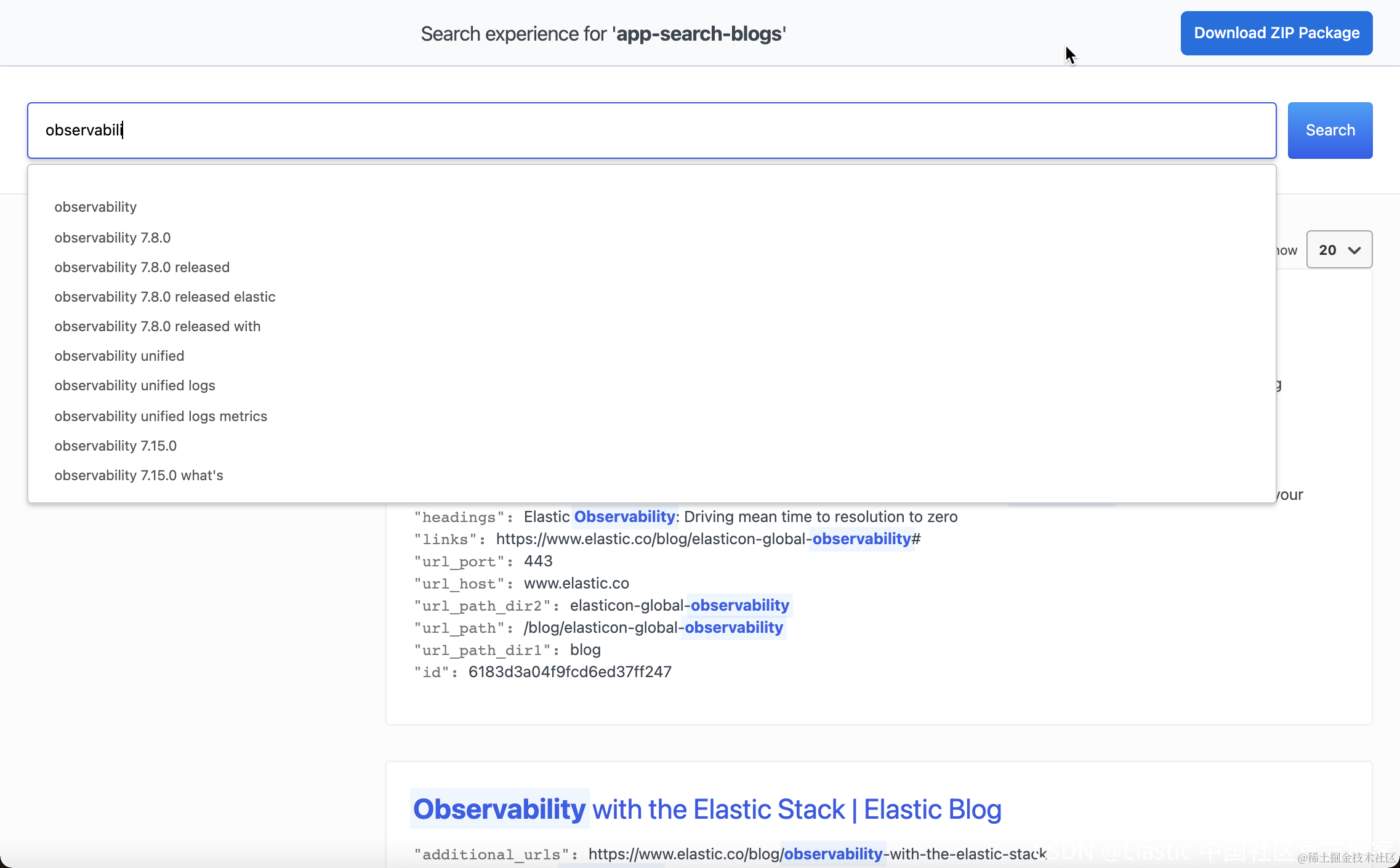 我们点击 Search UI 右上角的 Download ZIP Package 按钮。这将生成一个 ZIP 文件,其中包含你可以在应用程序中使用的源代码。 我们下载这个 zip 文件。我们可以在本地部署这个 node 应用: