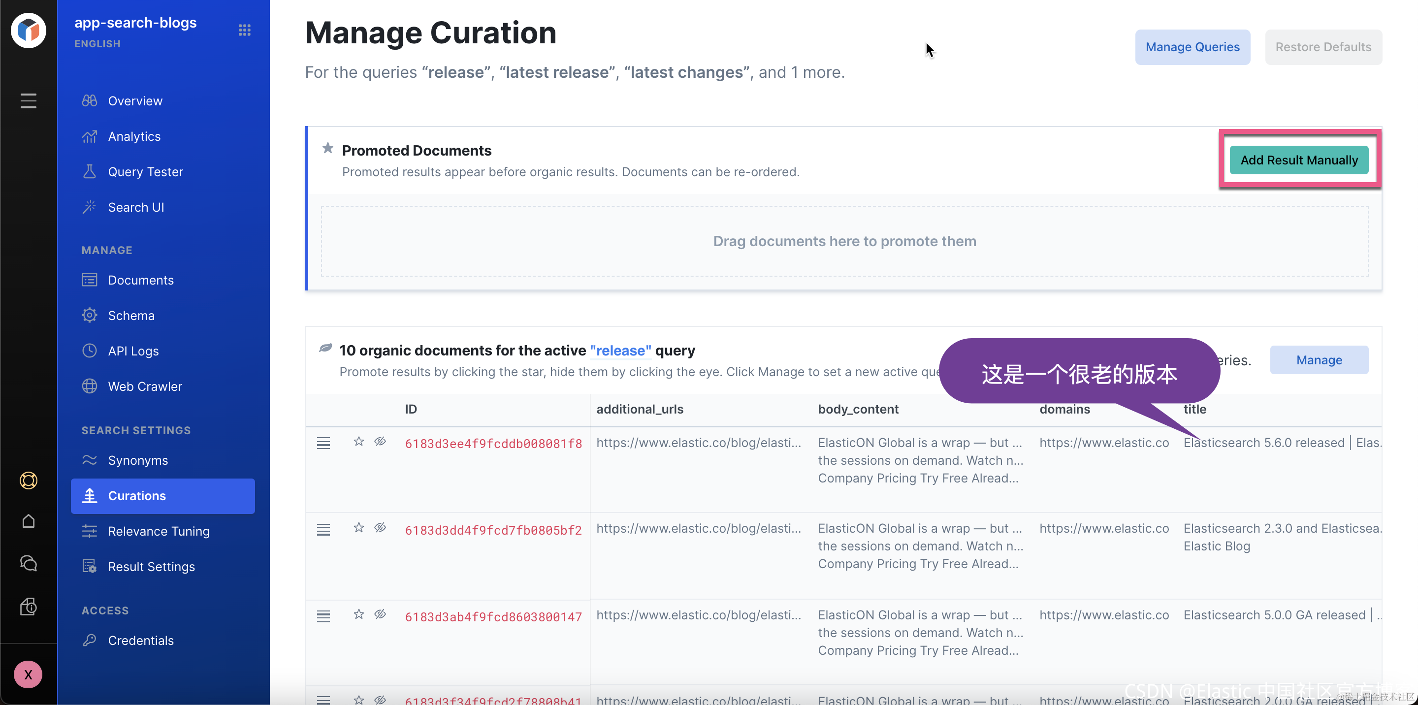 10. 单击“Continue”后,你将看到当前为查询 “release” 返回的文档。 请注意,第一个文档不一定是最新版本的版本。让我们手动添加与最新版本相关的博客页面。 点击 “Add Results Mannually”