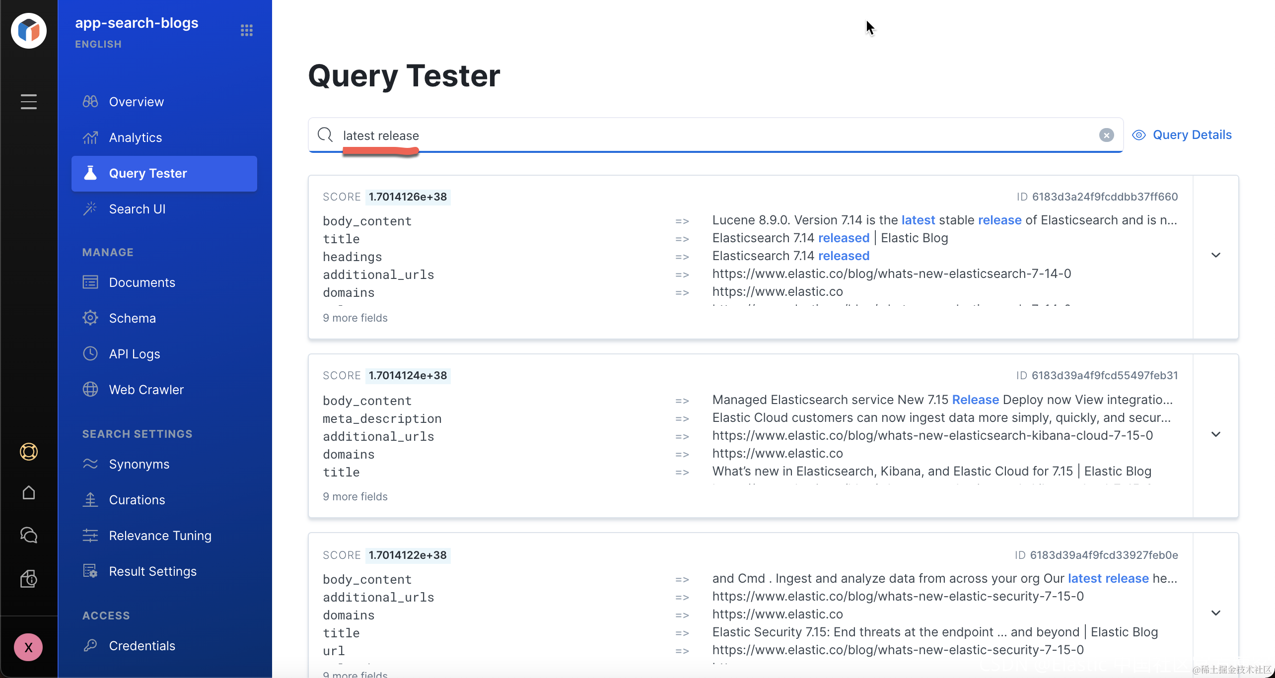 12、最后,进入“Query Tester”界面,搜索 “latest release”。 第一个文档将是最新版本的博客。