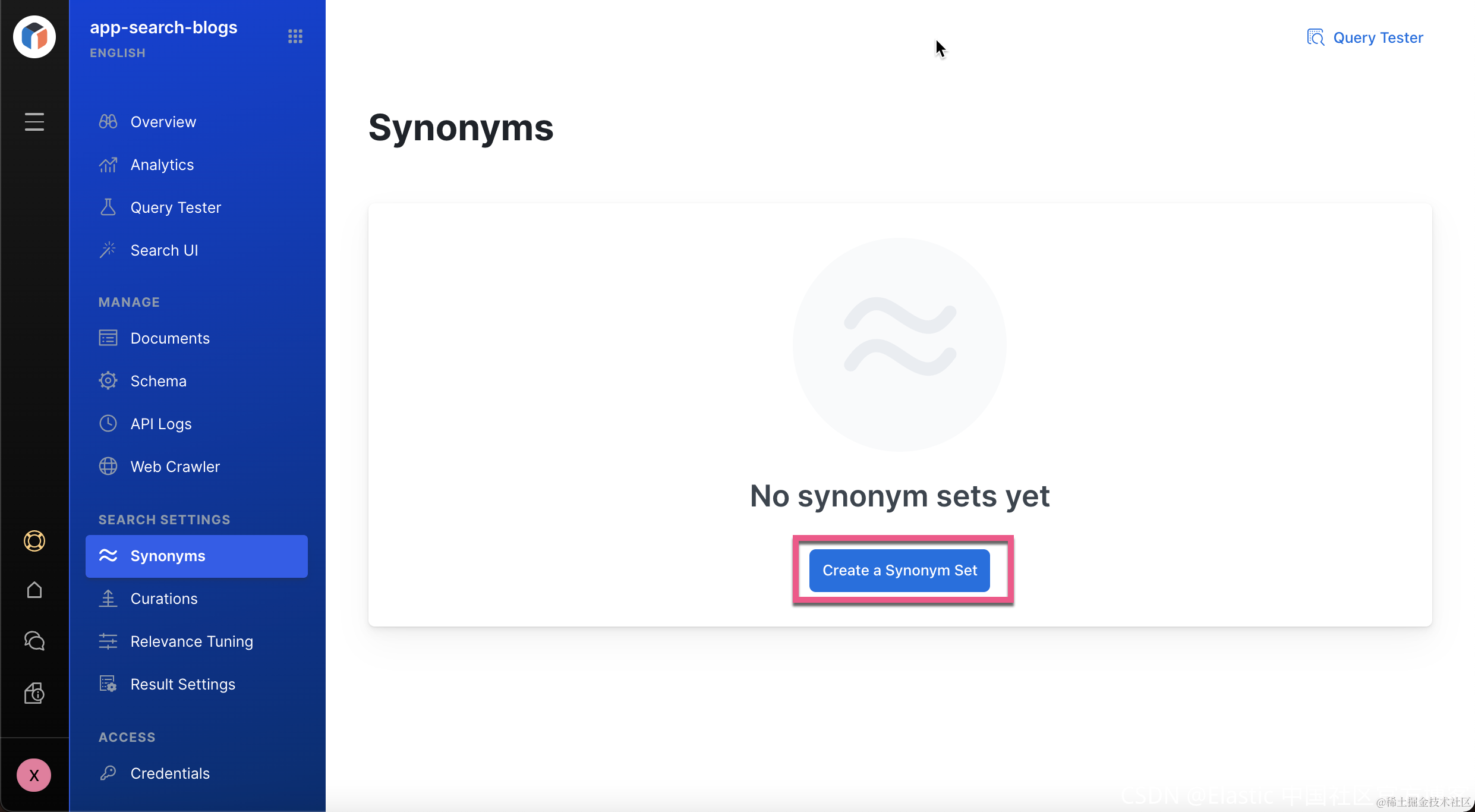5. 从引擎菜单中,选择 “Synonyms” 并单击 “Create a Synonym Set”: