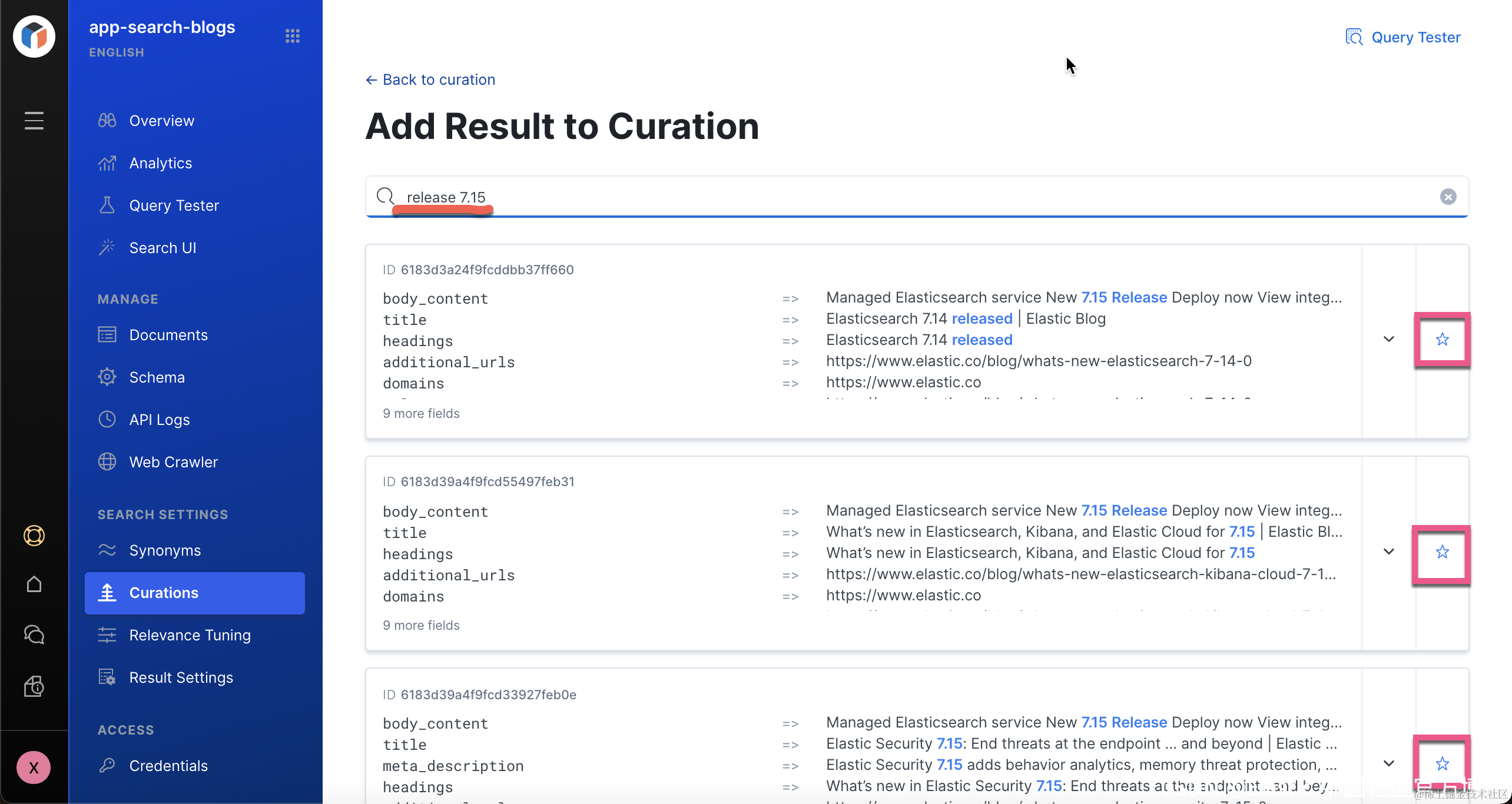 8. 在搜索 “release” 时,用户希望获得有关最新发布的信息。 你可以创建 curations 来选择将为此查询返回的文档。 curation允许你手动提升或隐藏特定查询的文档。