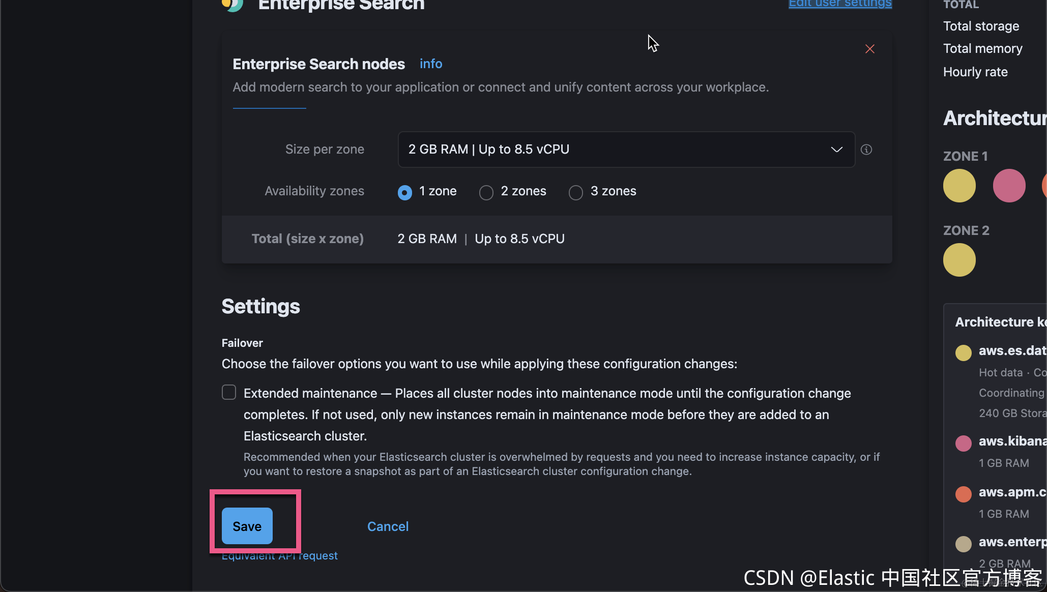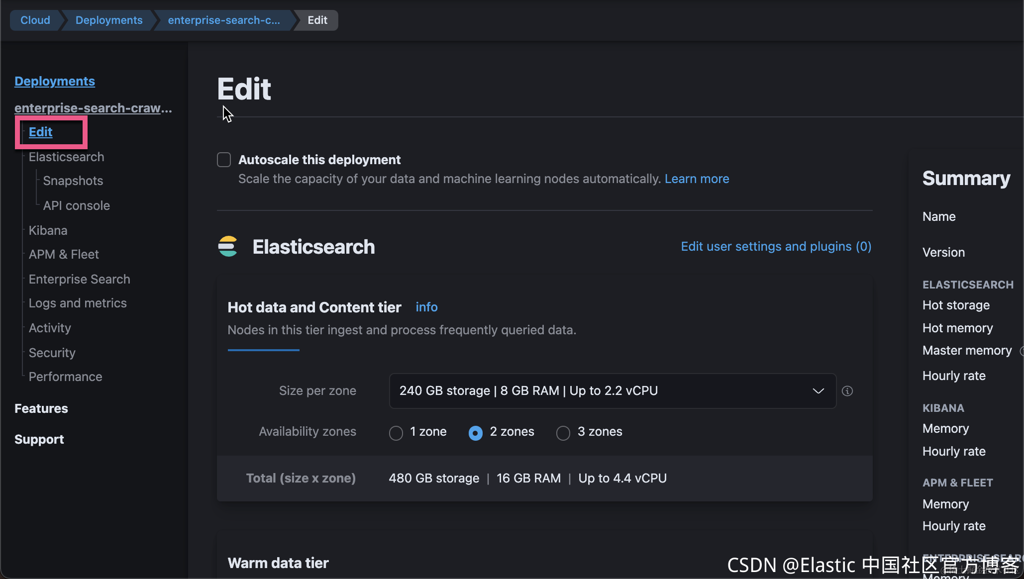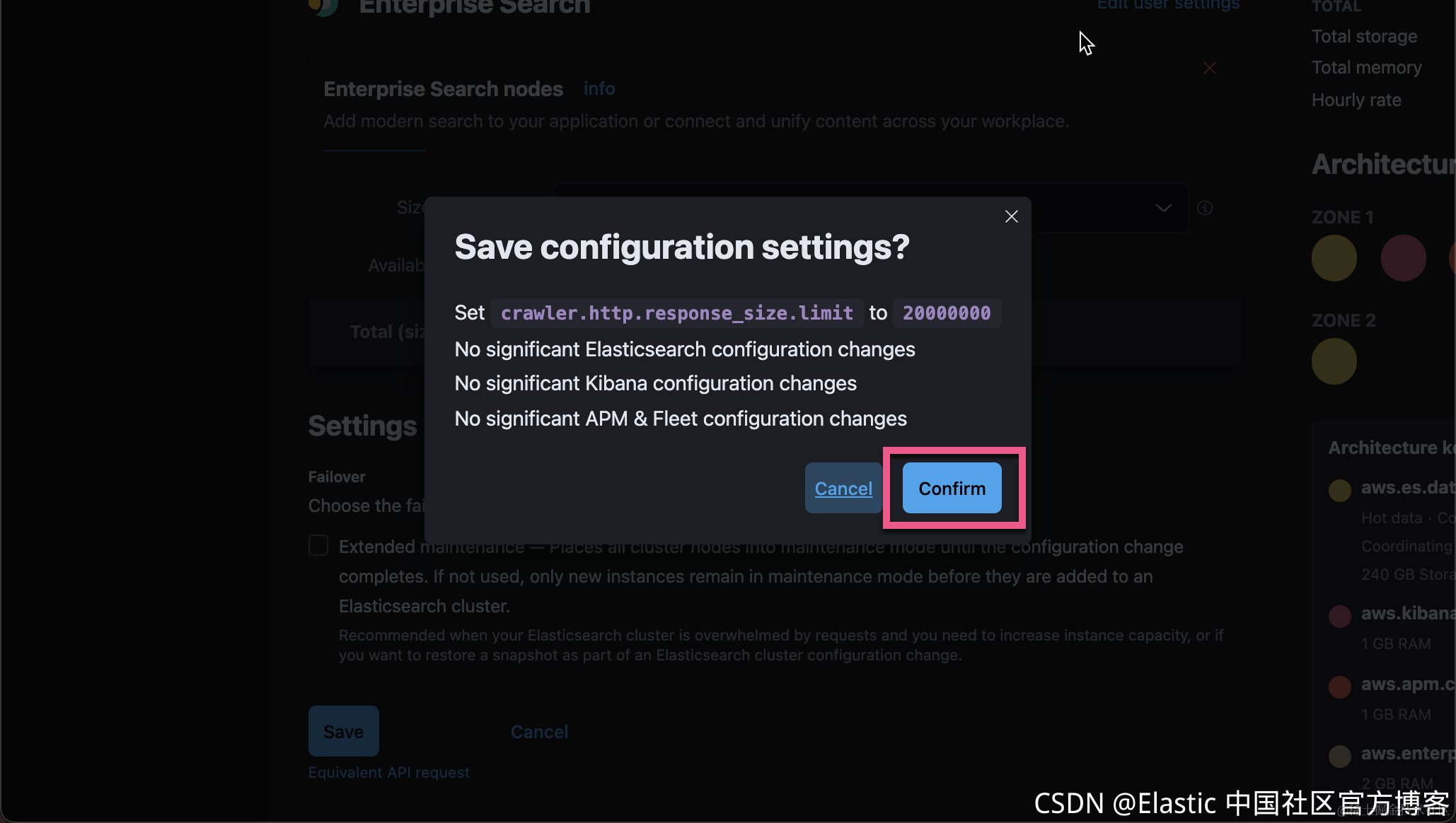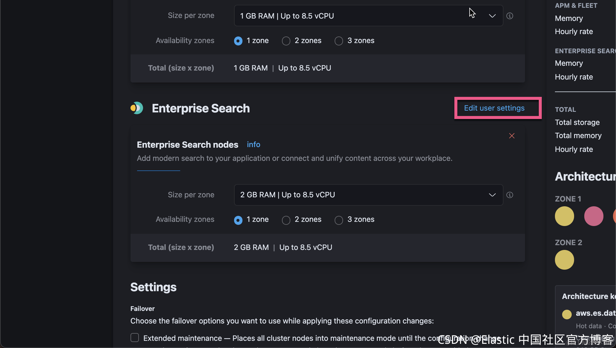 在上面我选择离我们较近的 Hong Kong 及 AWS Web Services。我们可以为自己的部署取名。我们取一个叫做 enterprise-search-crawler 的部署。在上面,我们可以看到每个小时需要花费多少钱。请注意:在此期间,你并没有要求提供你的信用卡支付信息,所以你不比担心在试用期间你需要付任何的费用。我们可以点击 Advanced settings 来查看当前的配置。如果你不满意,你可以进行调整。
