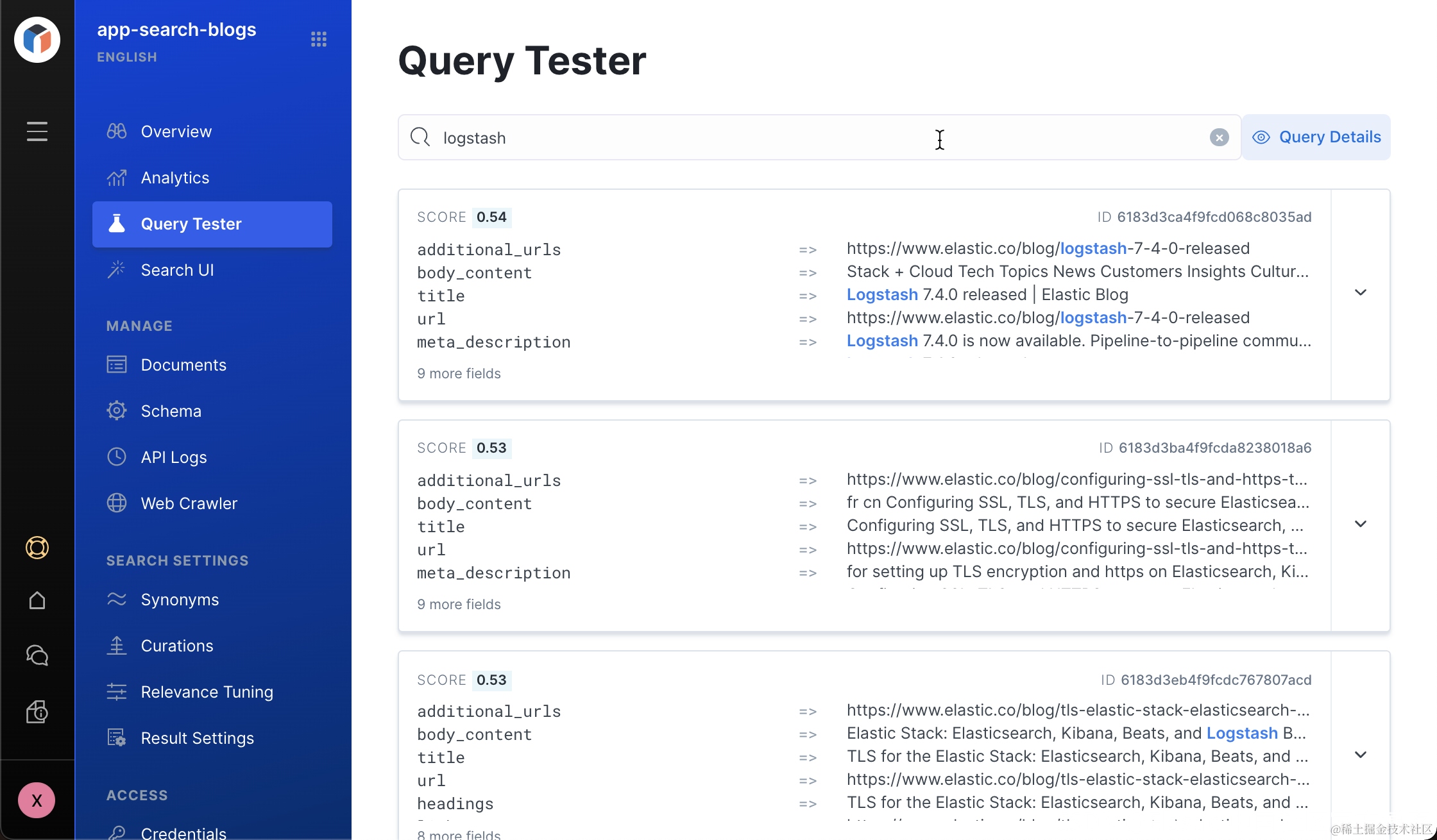 我们可以使用 Query Tester 来试一下查询 logstash 相关的文档: